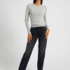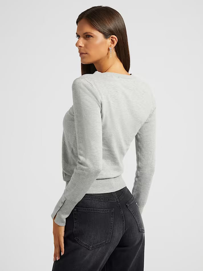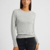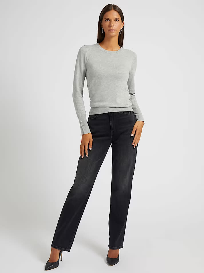 Classic fit crew neck style knit from Guess. Silver button feature on a ribbed cuff. A dressy basic for jeans or even under a suit.