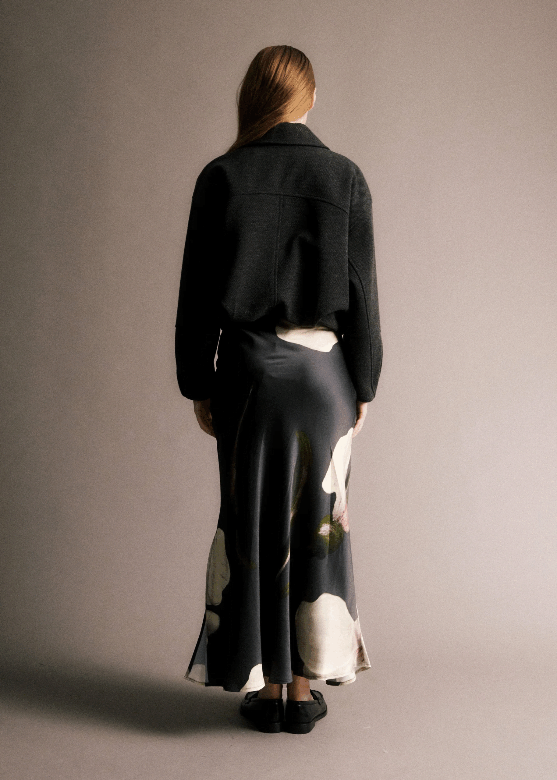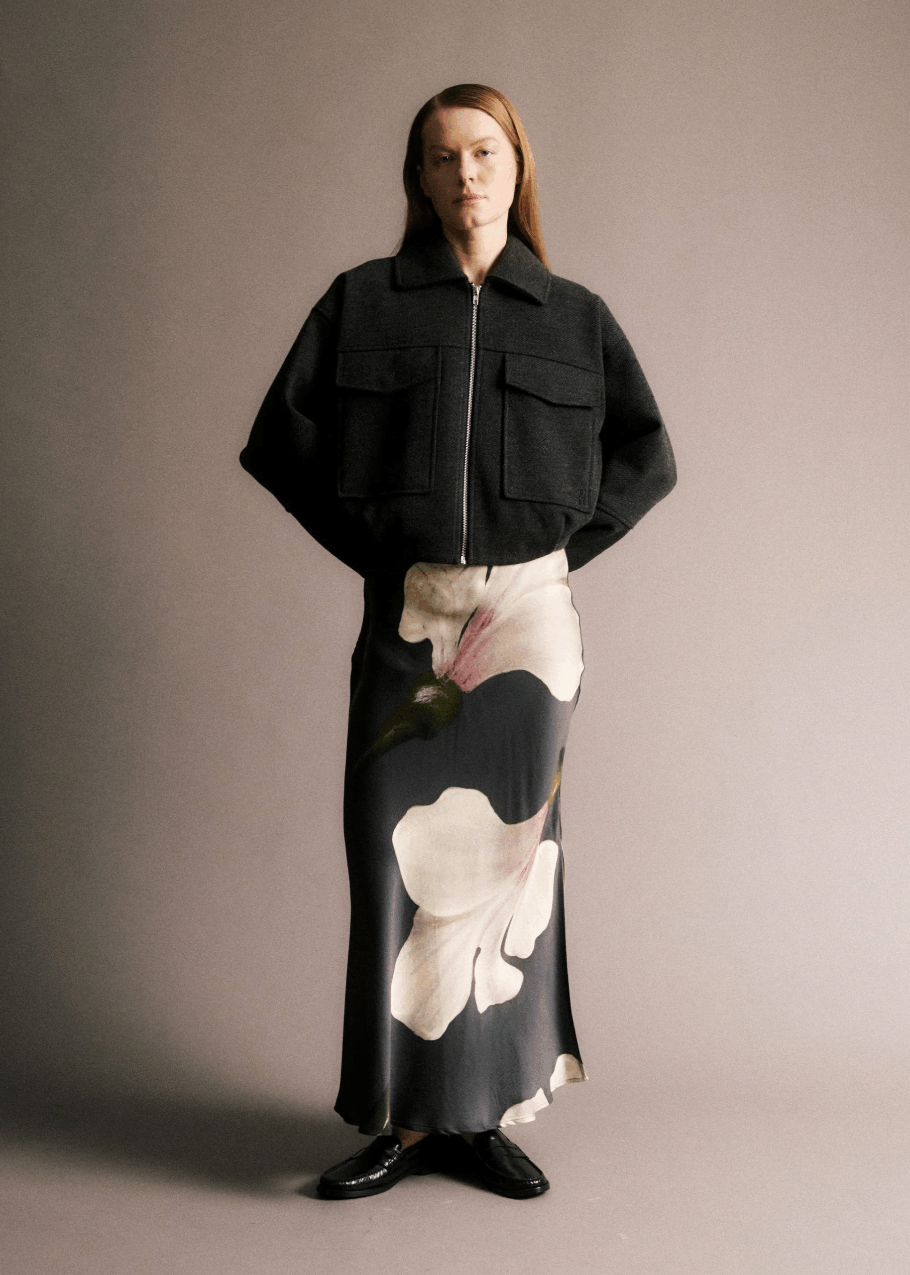 This floral midi skirt features a slit on the side of the left leg and a thin waistband that is slightly elasticated for comfort but also has a zip to the side to open and close. The dark grey base on this skirt works beautifully with the green leafy tones throughout and also showing a pop of colour with the touches of pink on the white lillies. Wear with a fitted top and ankle boots this Autumn/Winter.