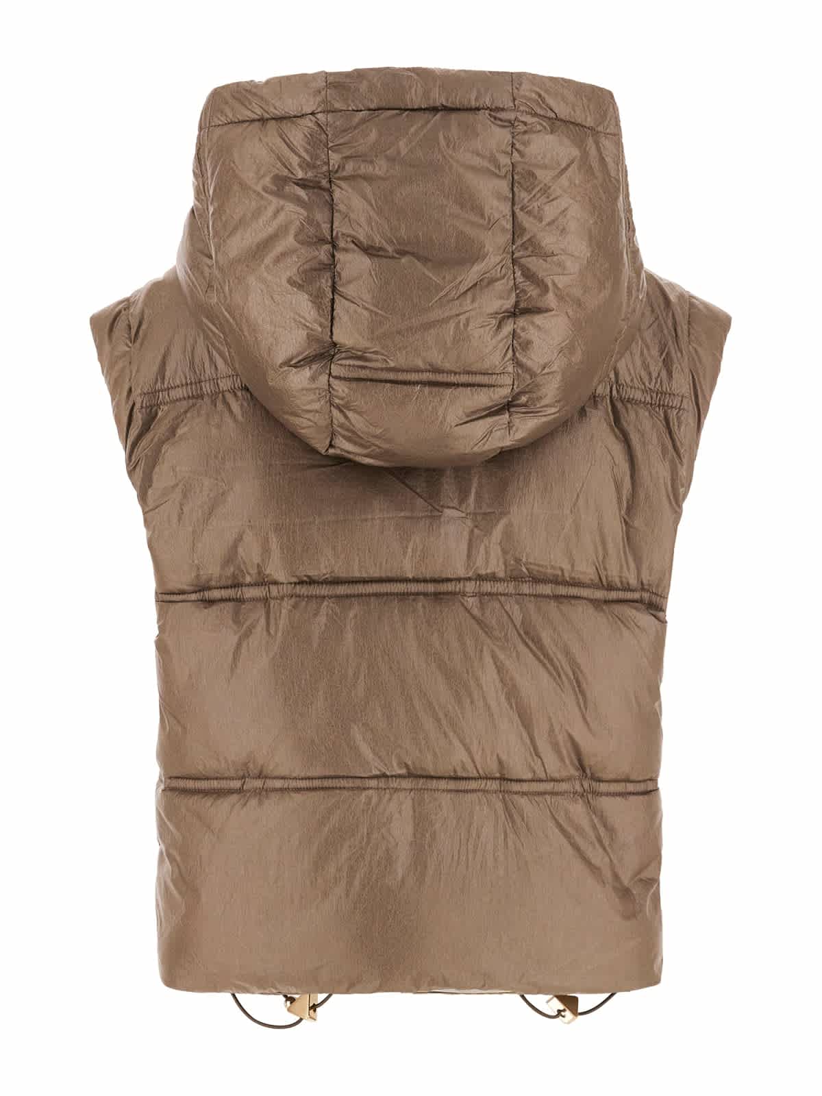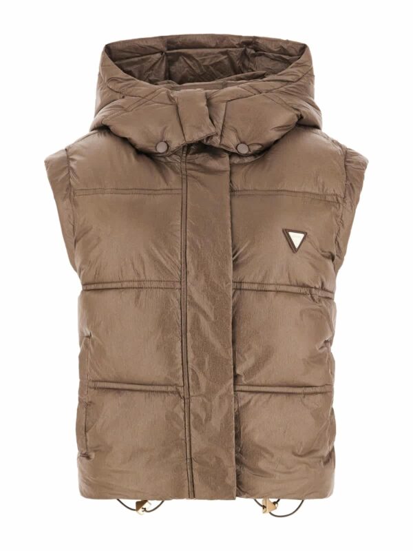 A lightweight cropped length padded gillet from guess in a neutral taupe/bronze tone. Gold button details.
