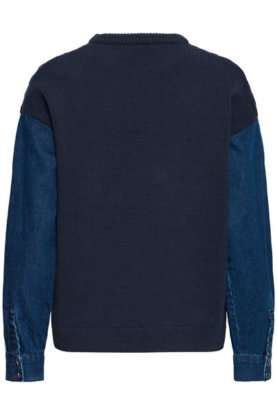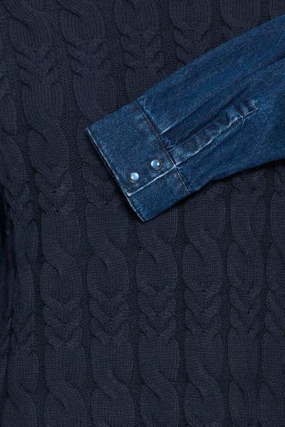 This oversized cable knit features a round ribbed neck and long denim sleeves with buttons on the cuffs. It would look gorgeous worn with a pair of indigo jeans and tan boots on the colder days.