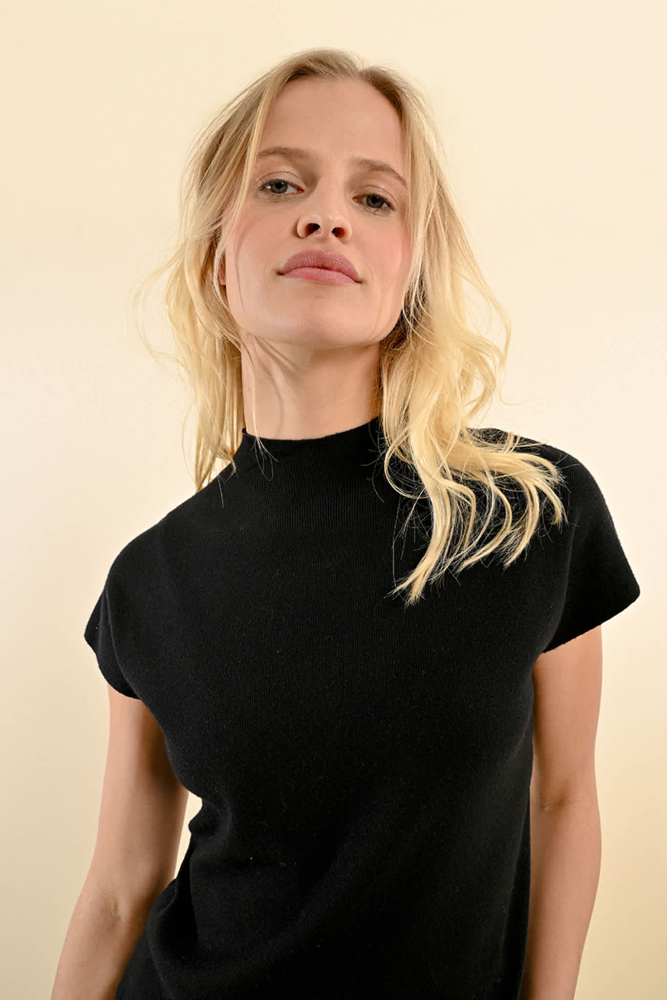 Viscose sweater that is finely ribbed.Short, drop shoulder sleeves witha a semi-high neck collar.