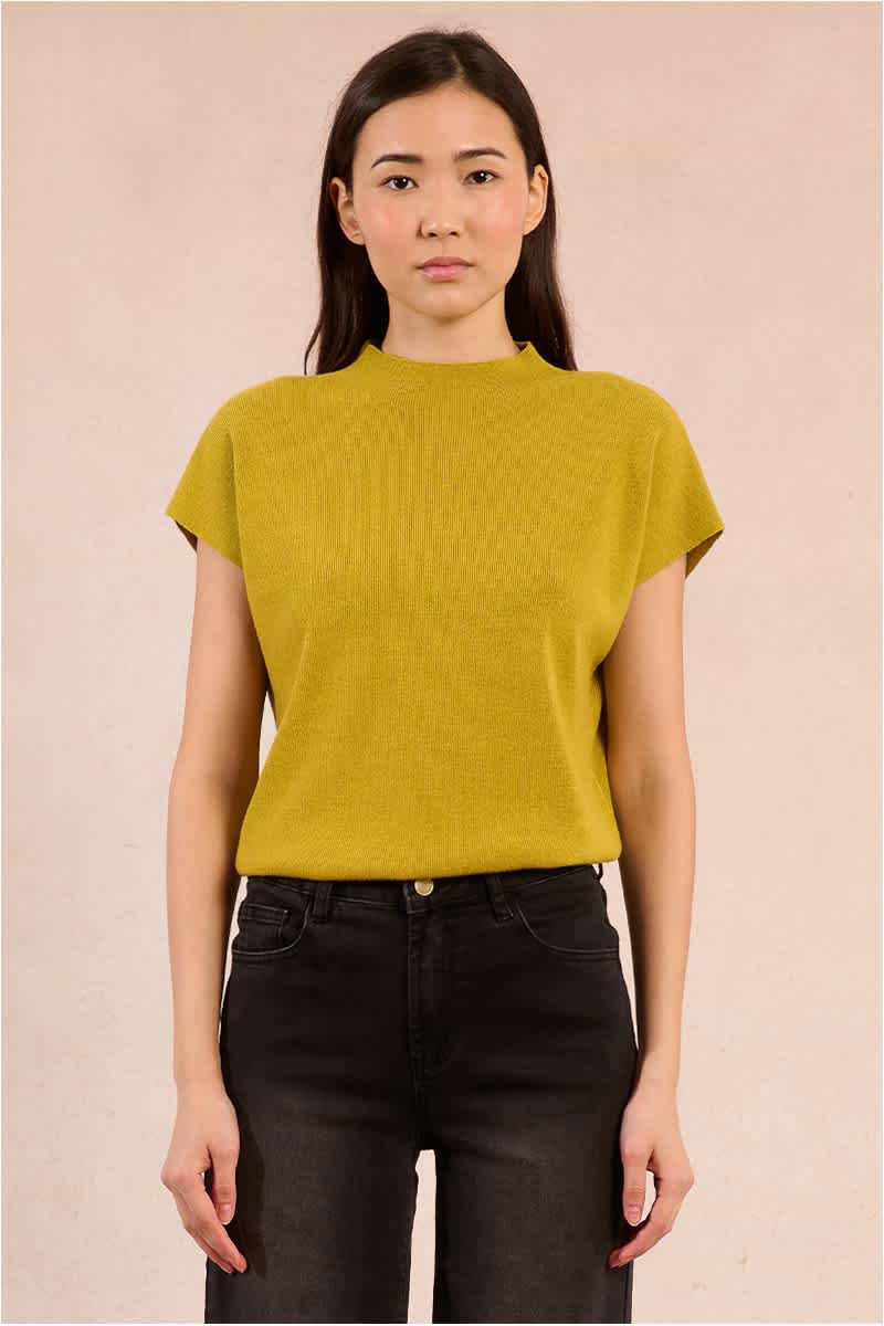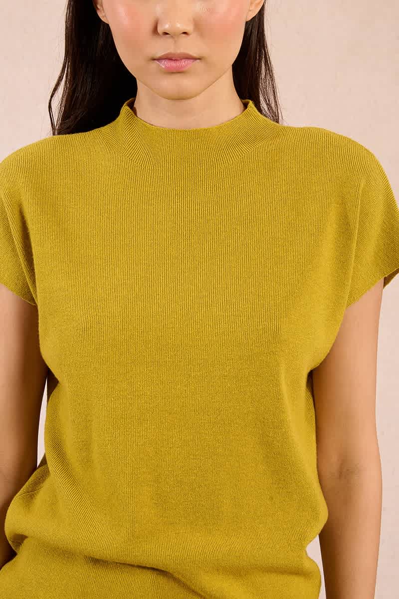 What a colour! Viscose sweater that is finely ribbed. Short, drop shoulder sleeves witha a semi-high neck collar.