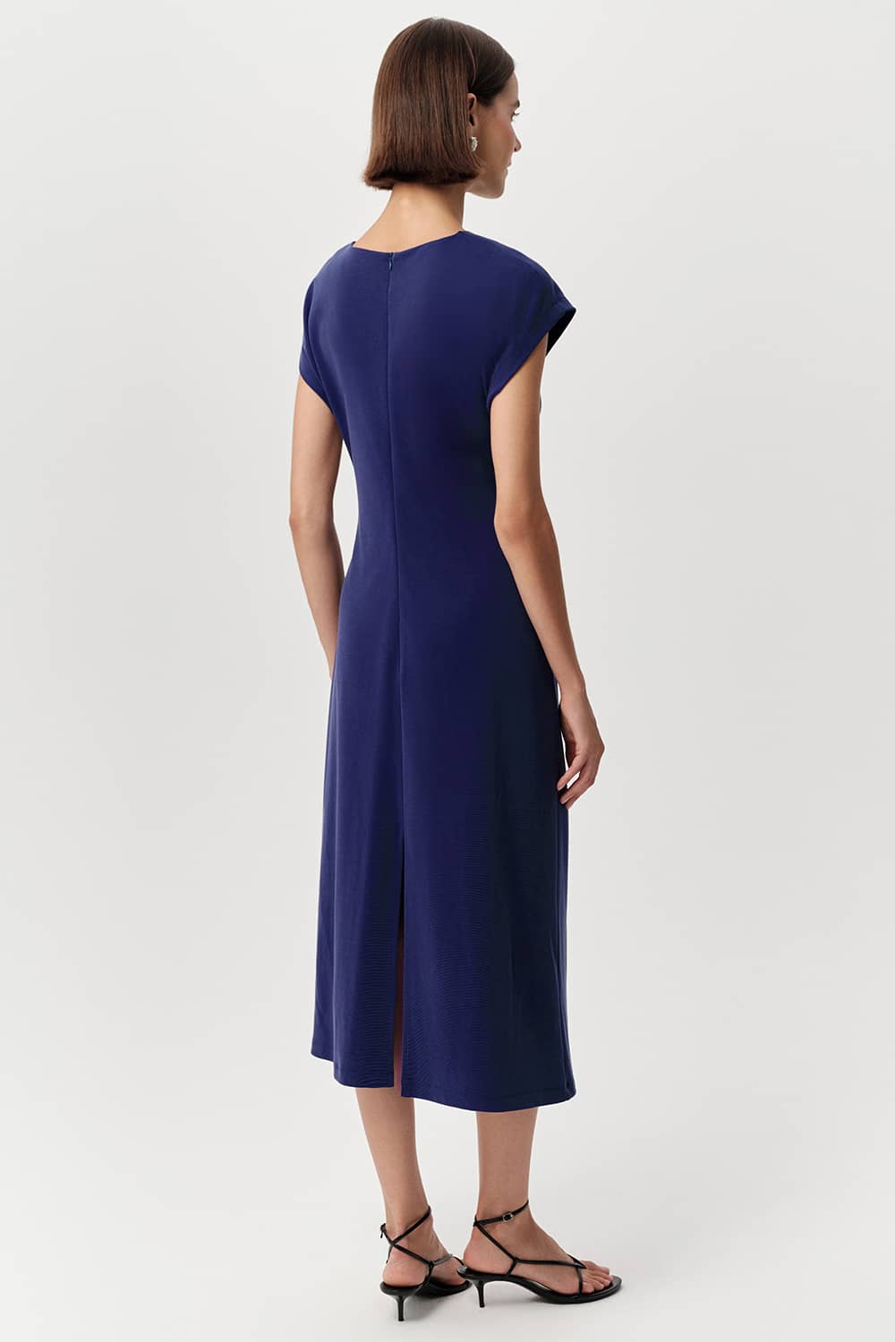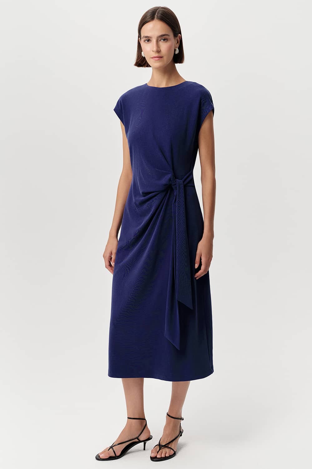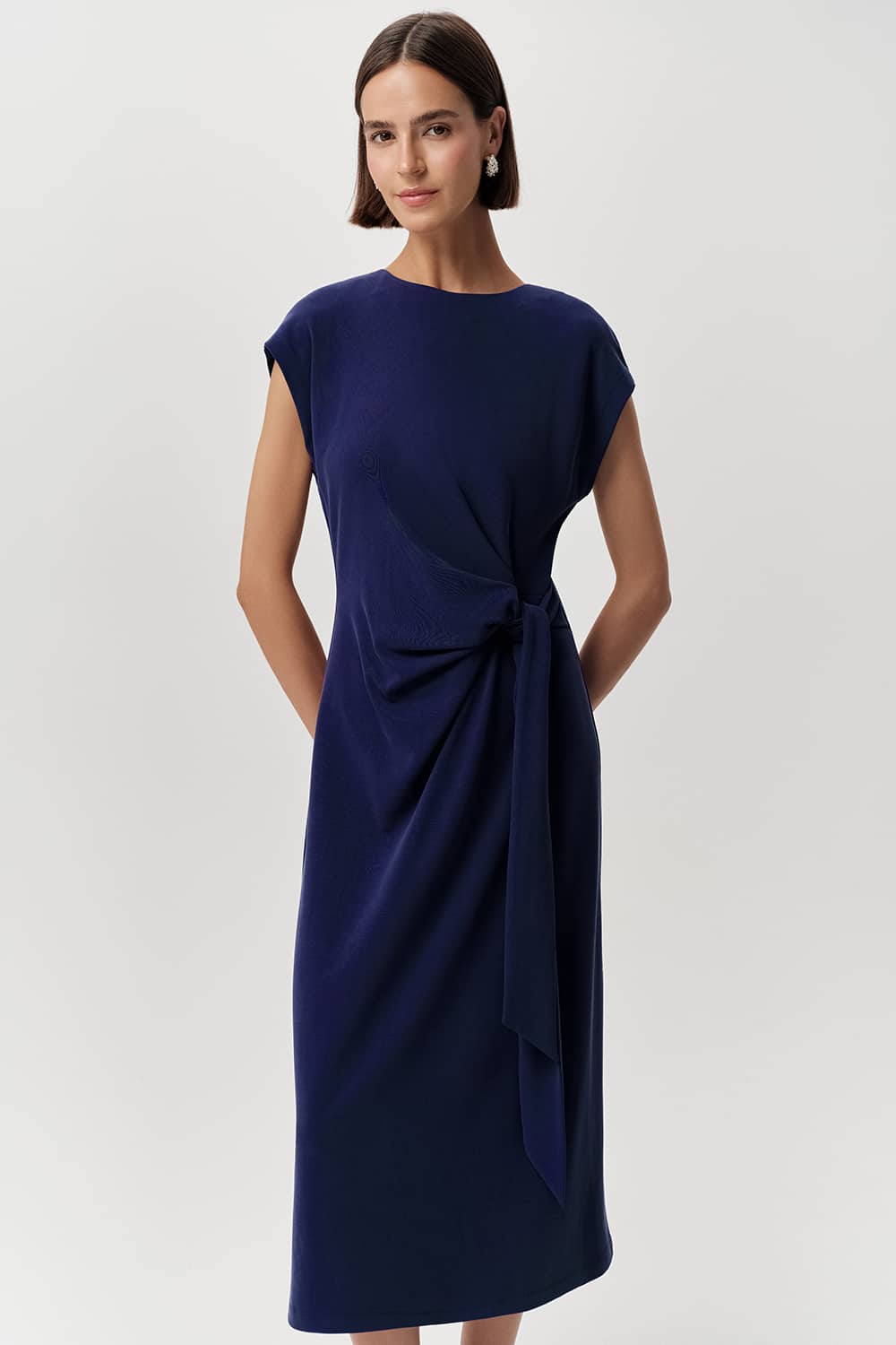 We adore the simplicity of this fitted, midi dress in navy blue. It features a cap sleeve and has a beautiful ruched detail at the waist that ties on the left hip creating a very flattering silhouette. The material is stretchy making this dress a very comfortable piece to wear. It has a zip at the back of the neck to close and a slit at the back of the dress in the middle. Perfect for any occasion.