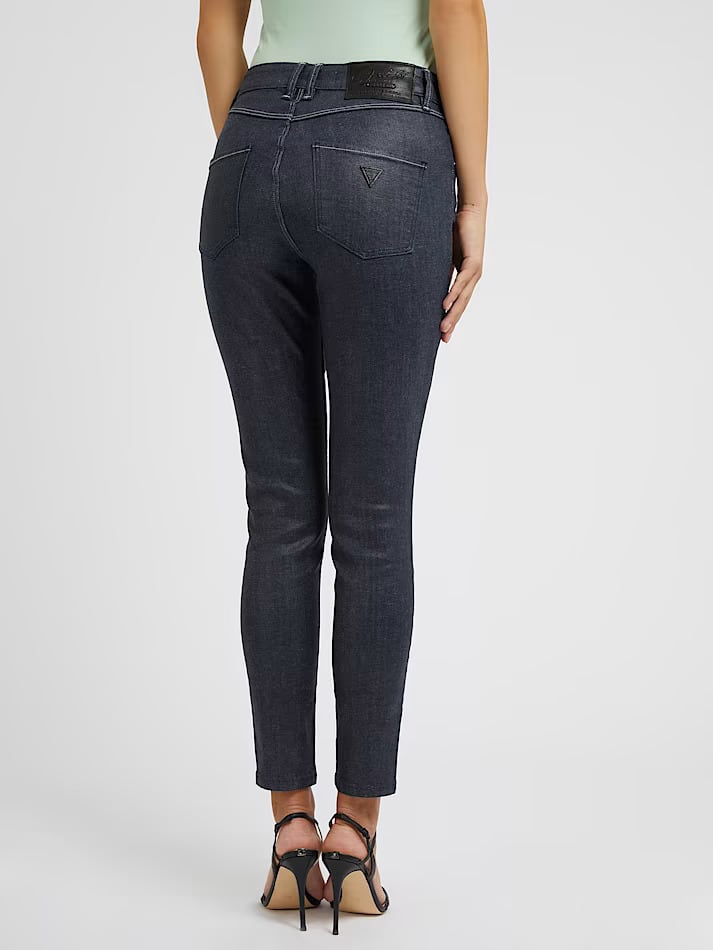 Blue/black skinny leg jeans with a coated finish and super high waist.