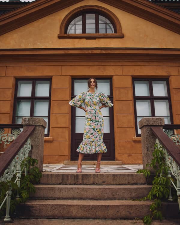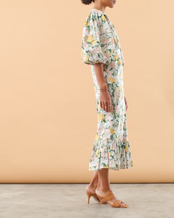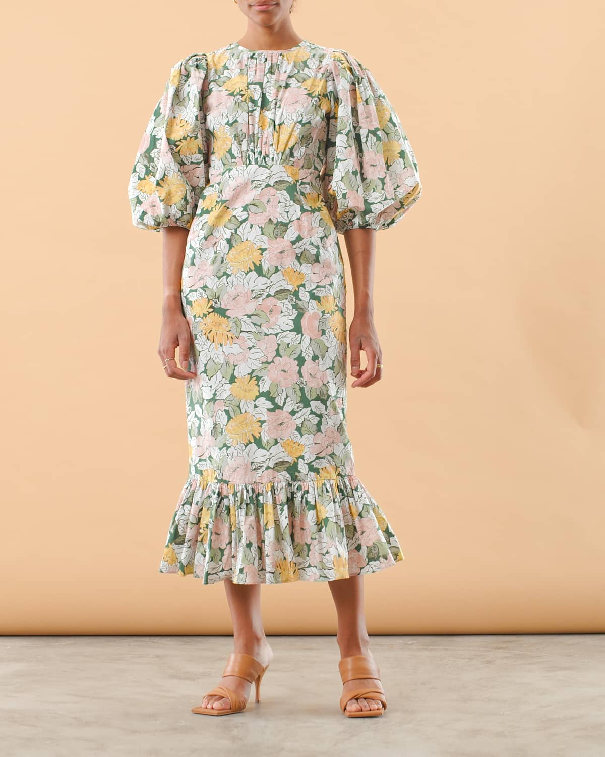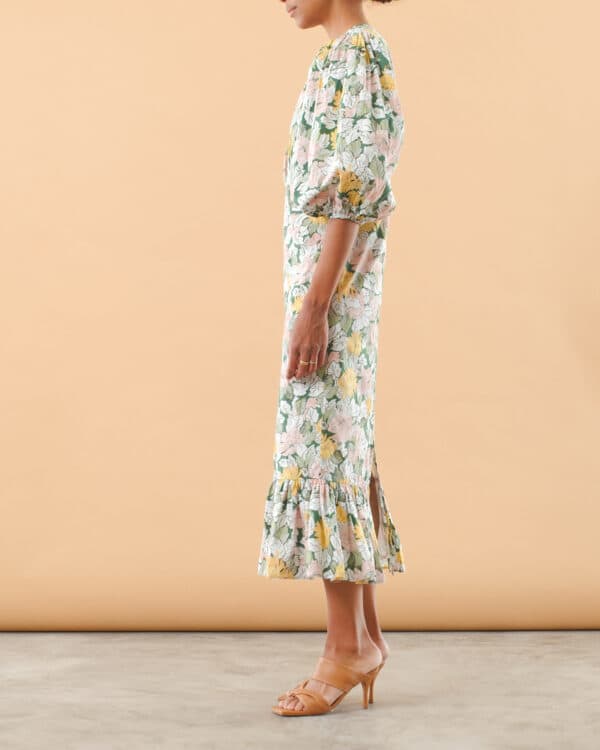 The Festive Cotton Midi Dress is cut in our soft and slightly structured GOTS certified cotton quality. It has a midi length, fitted silhouette and three quarter long, puffed sleeves. The dress has a round neckline with gathers going down to the waist. It has a flounce detail at the hem of the skirt.