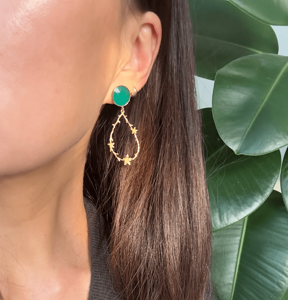 Fleur earrings are hand made with the most beautiful green faceted agate set in 16k gold electroplated brass and ornate 24k gold plated brass pendants. Simple and classic design, lightweight.