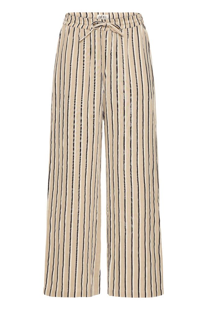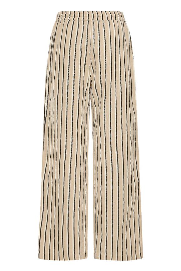 This striped beach pants feature a wide leg and a drawstring waist. They have pockets and an elasticated waist. The neutral colours in these pants make them a very versatile piece to have in your Summer wardrobe. Style these with a white tee and sandals for a cool, effortless look.