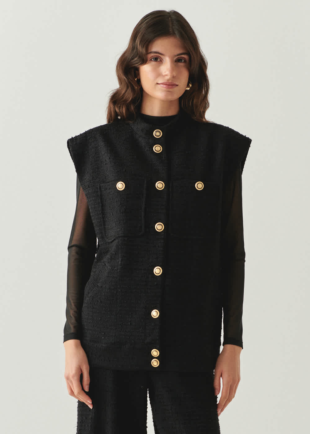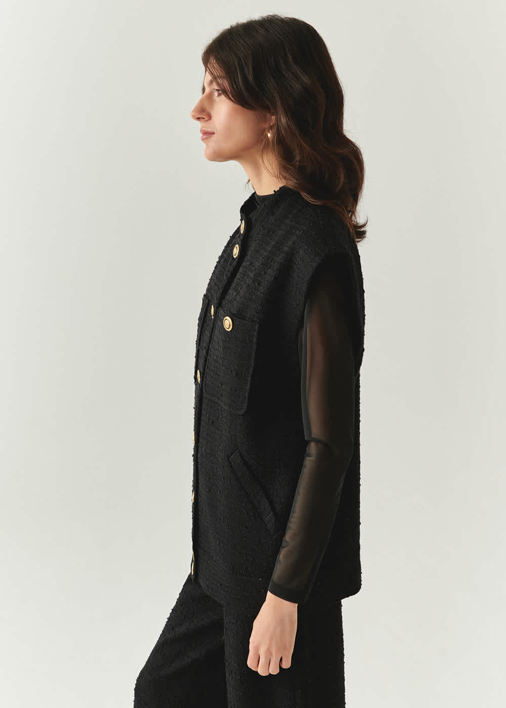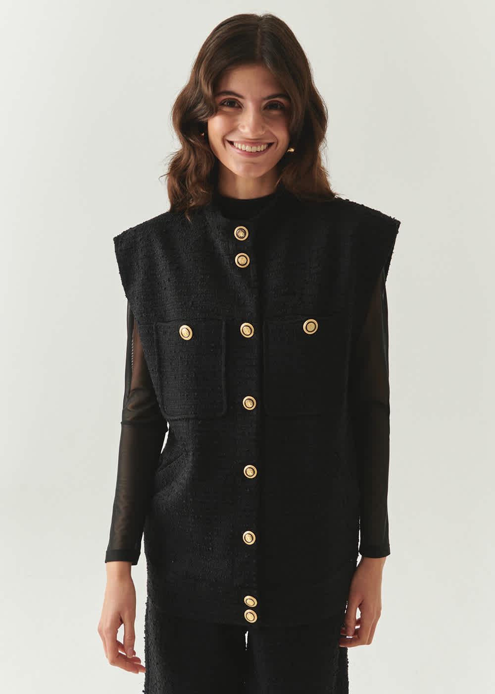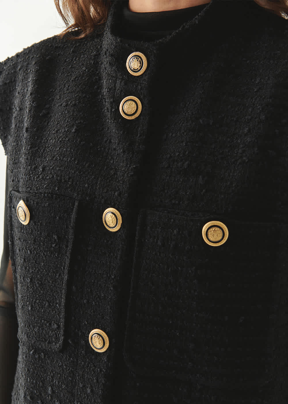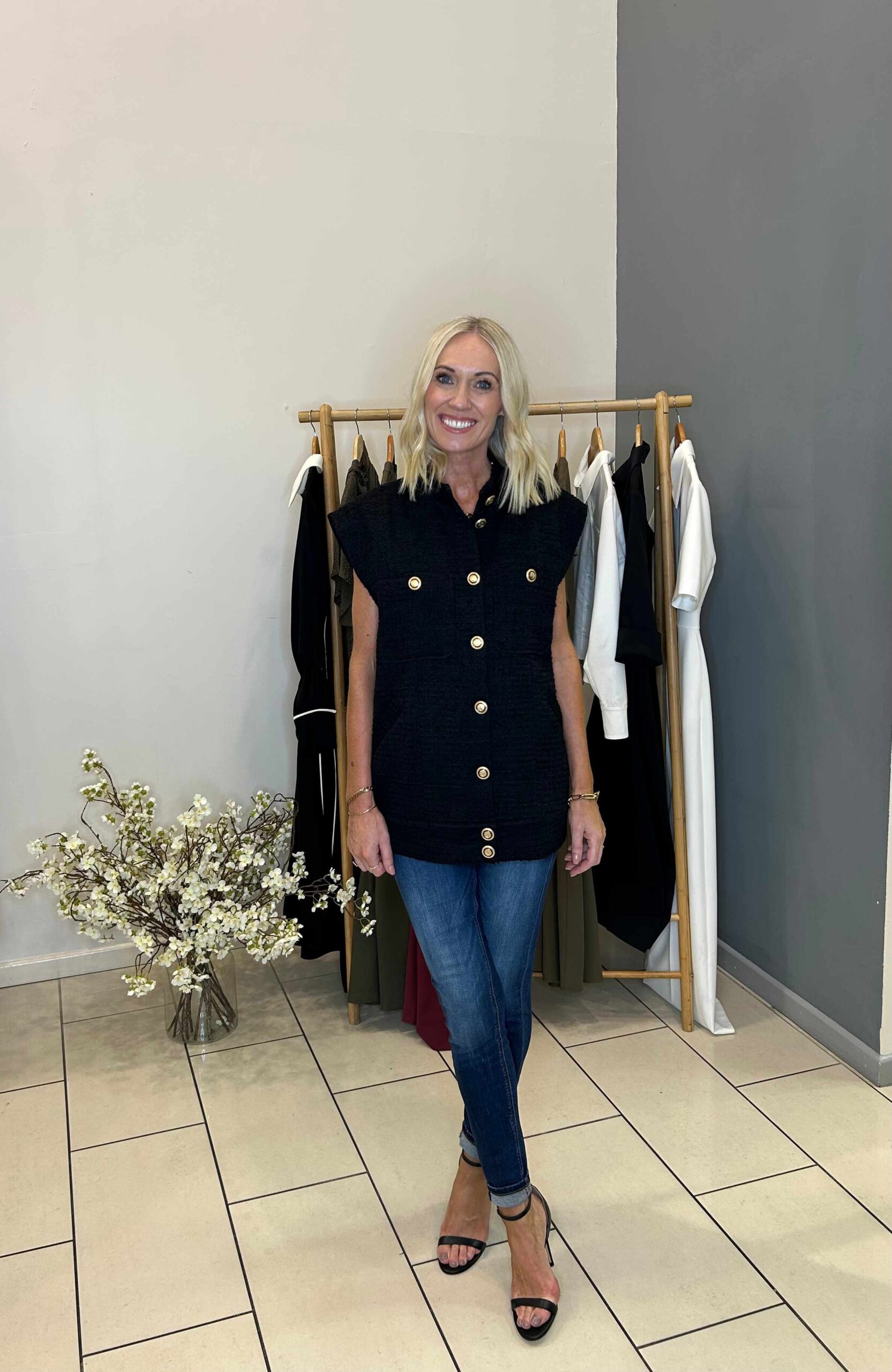 A beautiful piece to wear so many ways year after year. Gold button detail, pockets.
