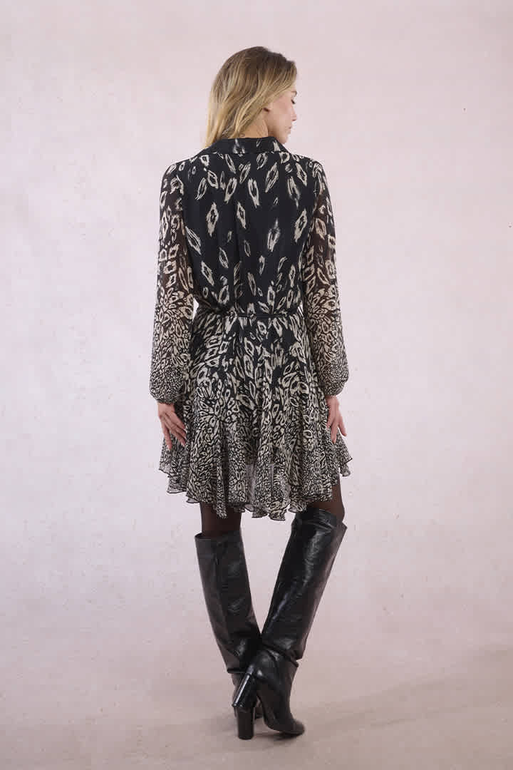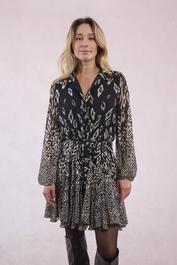 Light a floaty black and oatmeal patterned mini shirt dress with long sheer sleeves and frill hem.