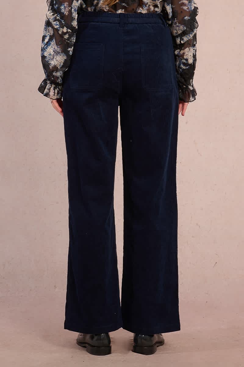 Wide leg navy corduory trousers with fly front close and elasticated waistband at the back.