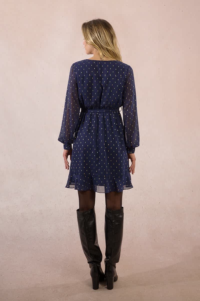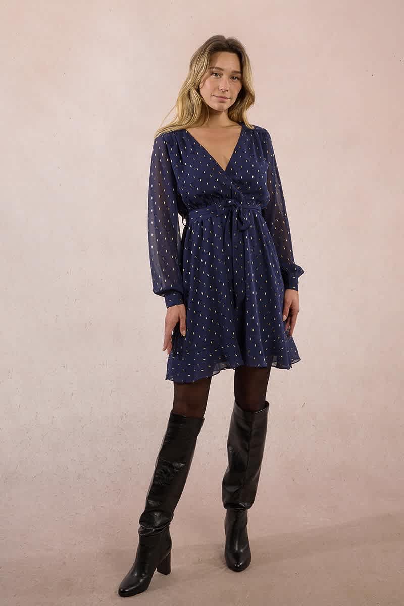 Navy light and flowy mini dress with long sheer sleeves, a V wrap neckline, elasticated waist and same fabric belt.