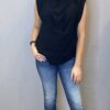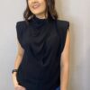 This black high neck sleeveless top is a classic piece to have in your wardrobe. It features a ruched neck where the material drapes across the chest and three beautiful gold buttons to fasten the back of the neck. At the buttons there is also a cut out detail to show a subtle bit of skin. The shoulders are padded and the hem dips slightly at the back.