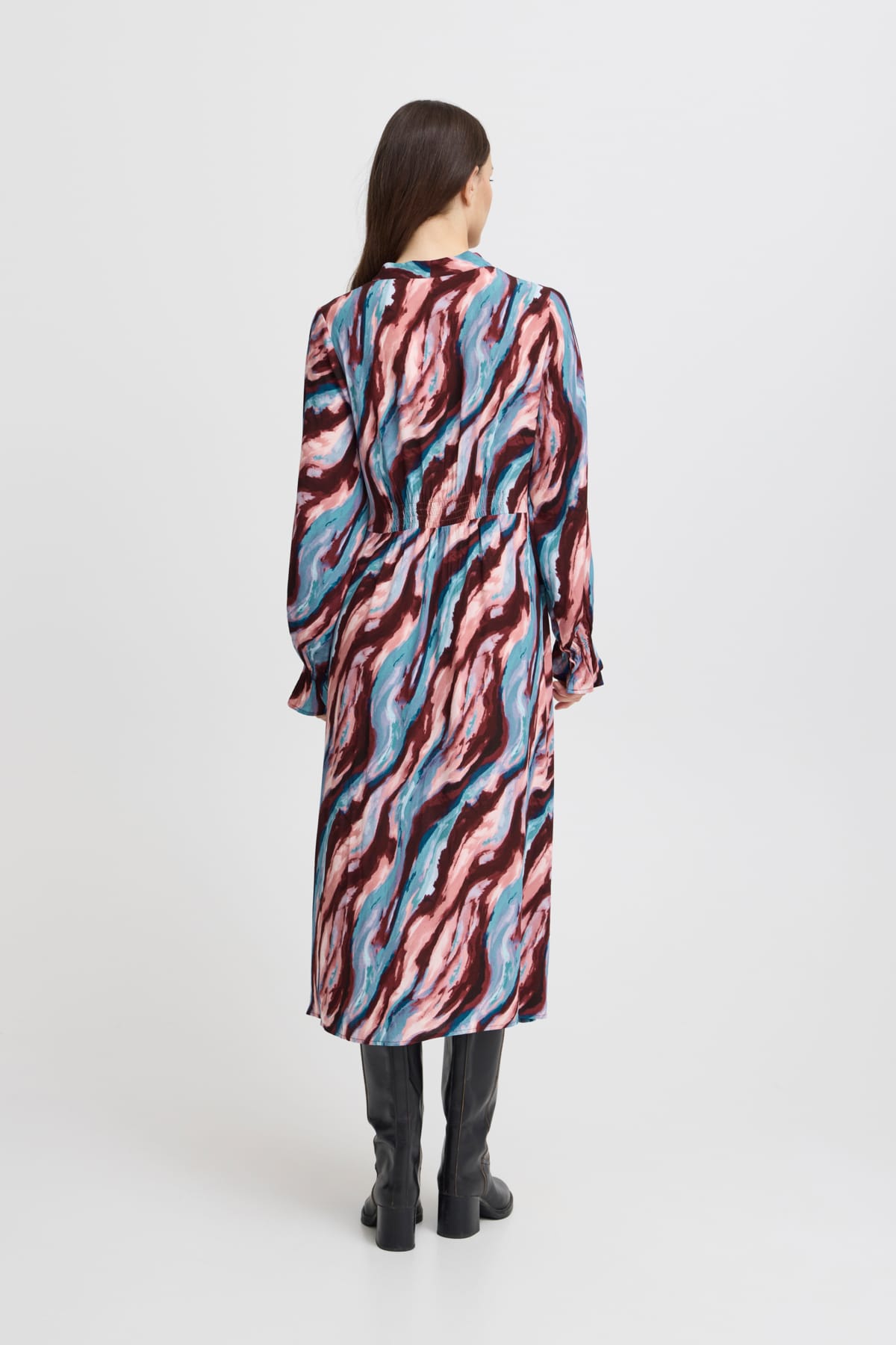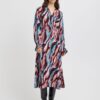 Long sleeve midi dress, elasticated back at the waist, wrap style bodice. Vibrant colour throughout. Perfect for adding some brightness to your winter wardrobe.