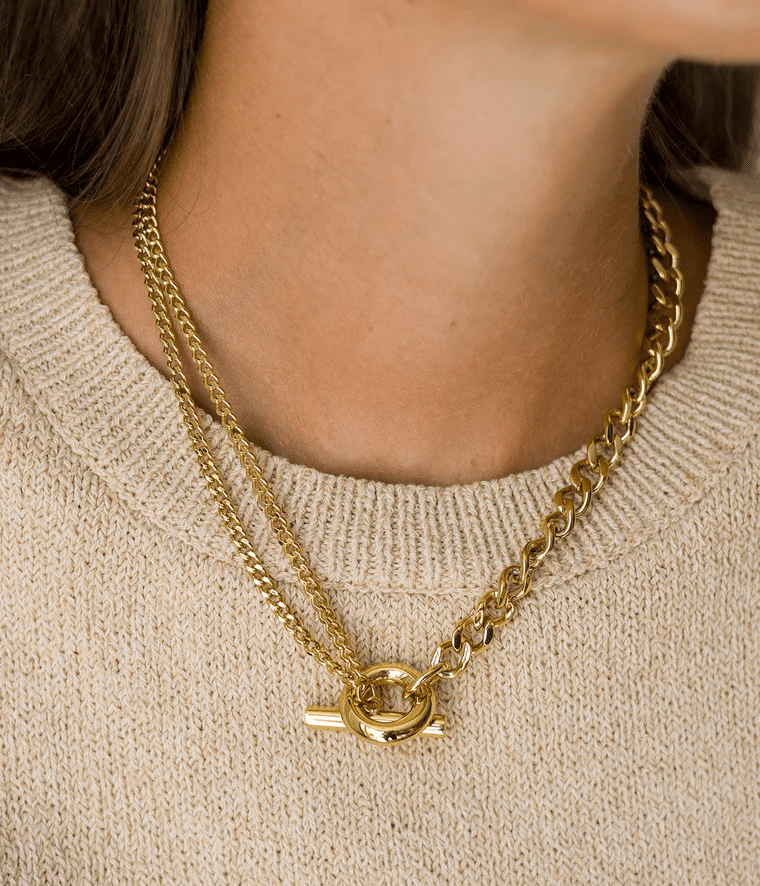 The necklace is composed of a large link on one side and a finer double link on the other.