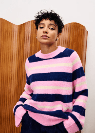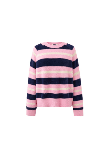 Super soft and fluffy striped knit with long wide sleeves and round kneck.