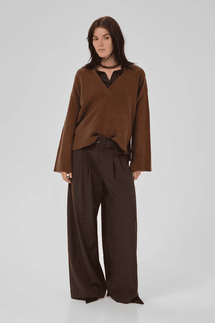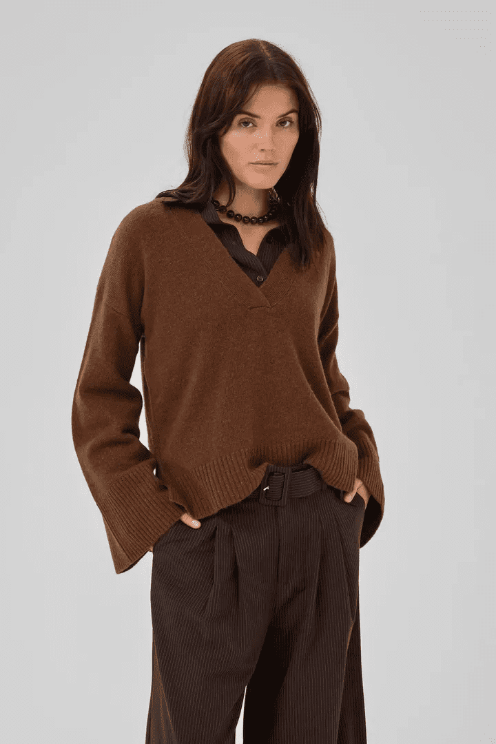 This V-neck knit offers a relaxed fit and modern silhouette, featuring wide sleeves and a ribbed hem. Comfortable and versatile, it’s ideal for layering and perfect for both casual and workwear looks.