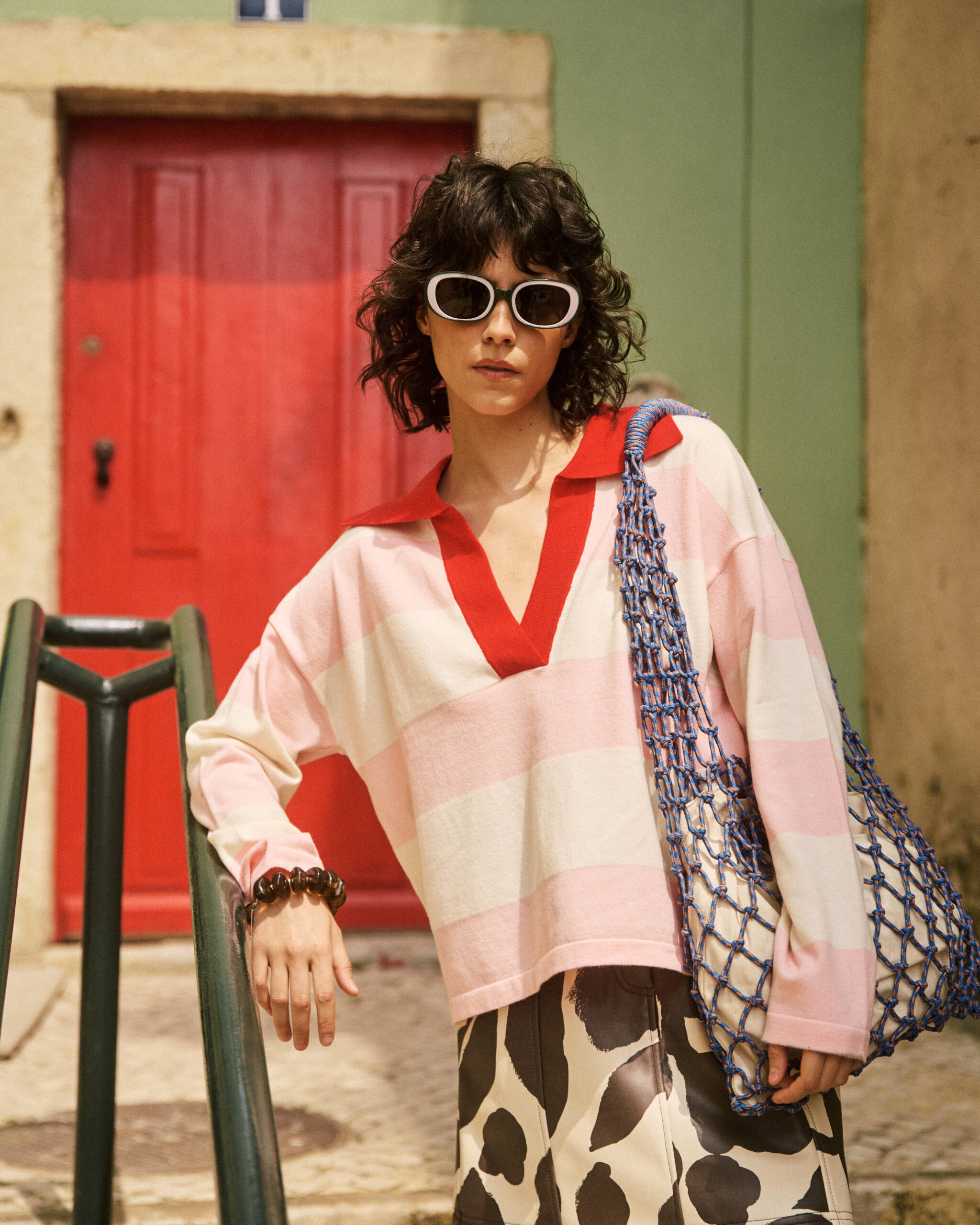 Super soft long sleeve striped knit with collared v-neck.