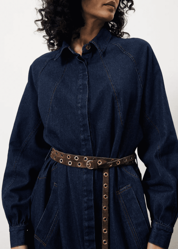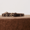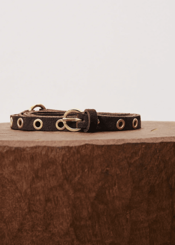 Smooth leather belt with contrasting gold eyelets. Double-wrap style and a small gold metal buckle.