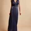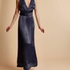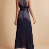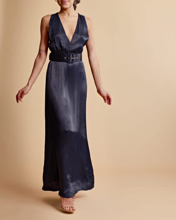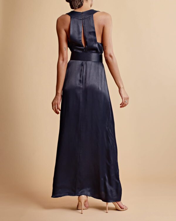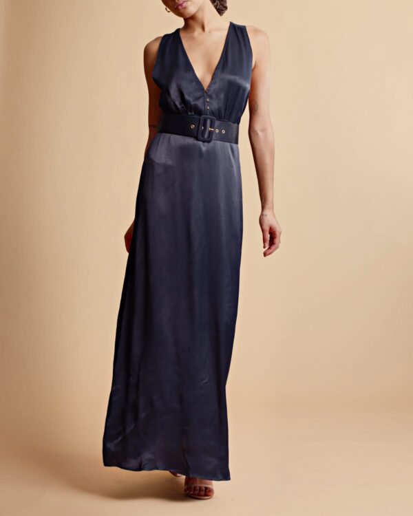 This Crêpe Satin Sleeveless Dress is cut in an elegant FSC certified viscose fabric. It has a maxi length, fitted silhouette and a halter-neck V neckline with button details down to the waistline. The dress comes with a loose, matching belt.