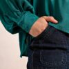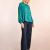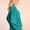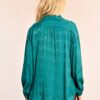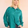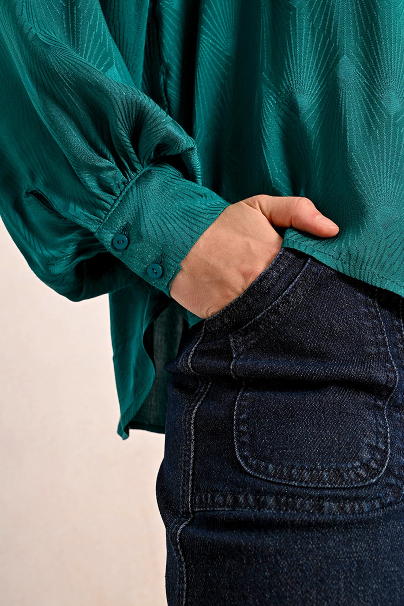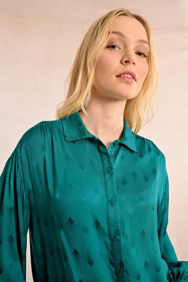 Teal long sleeve shirt with button down front and art deco style satin print.