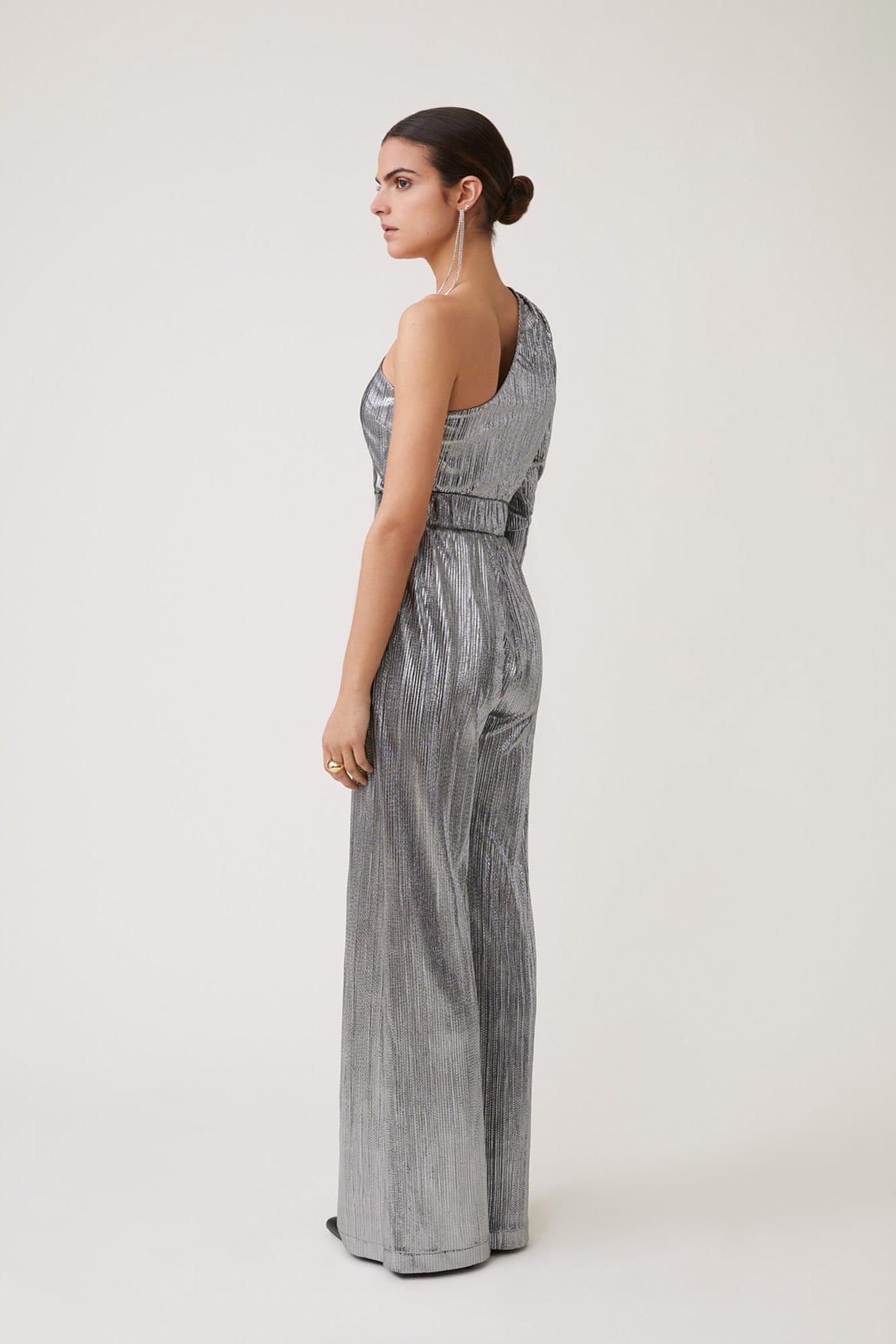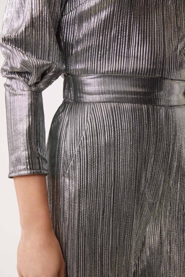 High-waisted pleated wide-leg pants and side zip closure. Two side pockets and made from a silver metallic effect fabric. A wow piece for your winter wardrobe. Pair with a black top or fine knit for a more paired back look or, wear with the matching Luna Top for a full metallice glam look.