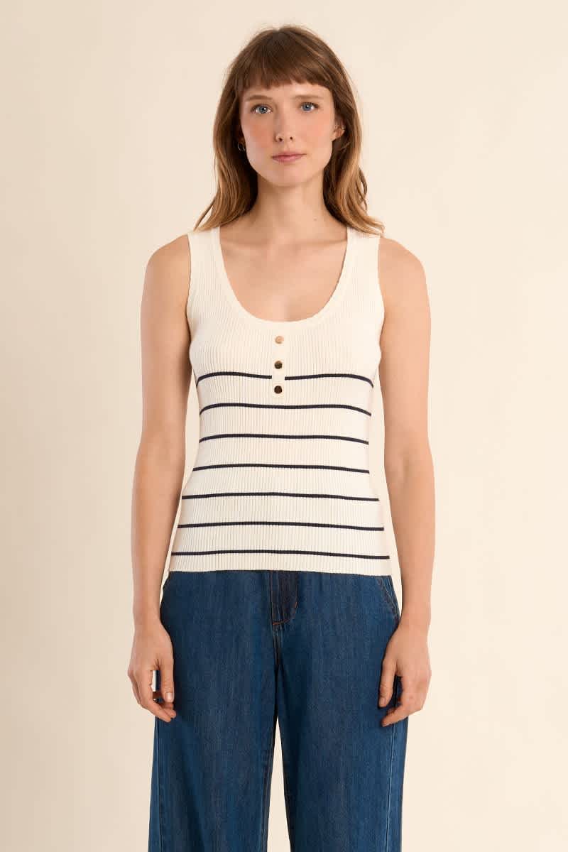 This striped tank top in off-white features a round neckline and three gold buttons down the front. The fabric has a lovely stretch for comfort and the hem around the neck and arms is slightly scalloped. It is a ribbed vest top with a navy stripe making this vest a versatile piece to add to your summer wardrobe. Wear with navy shorts or jeans for a cool casual look.