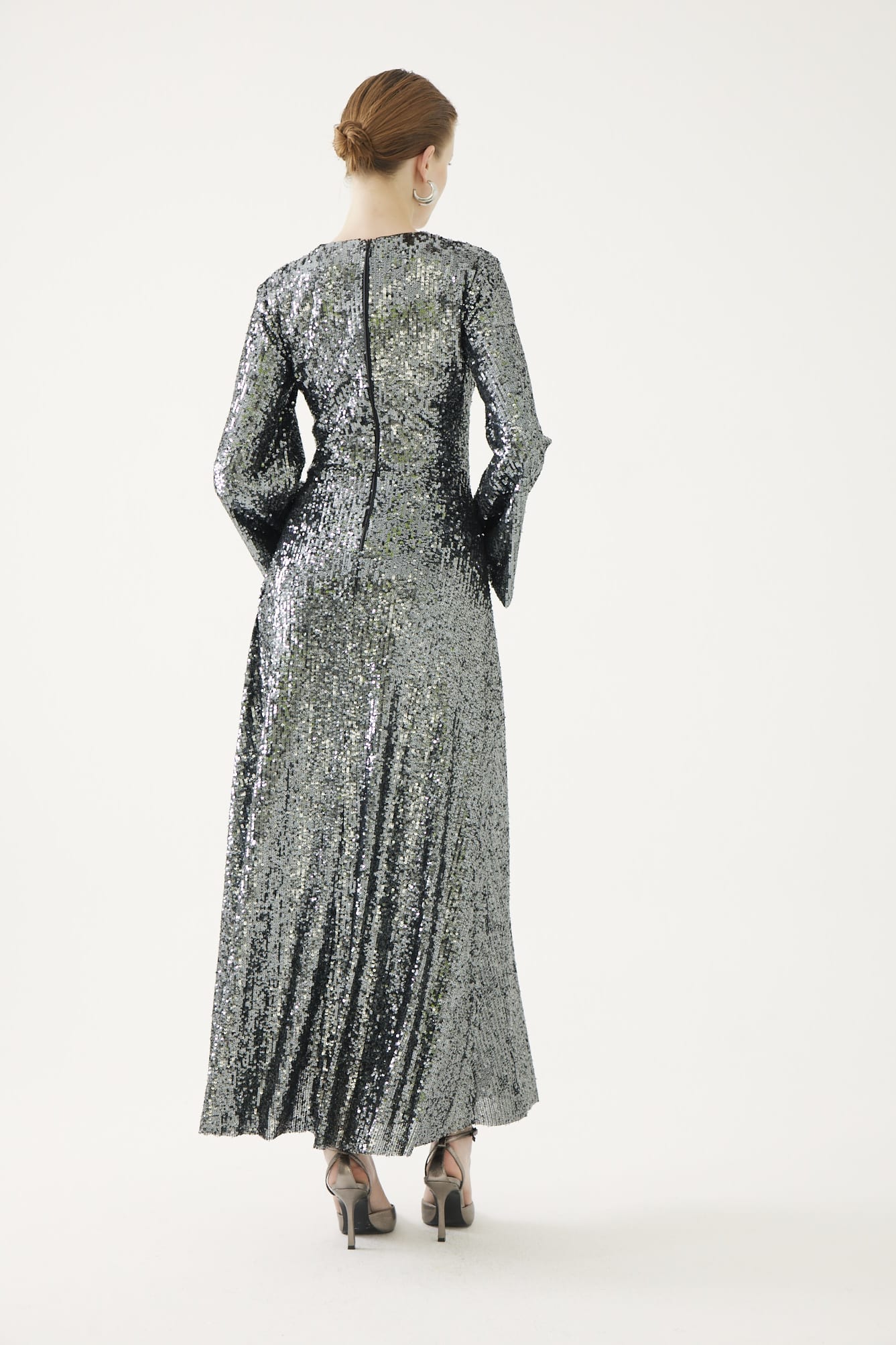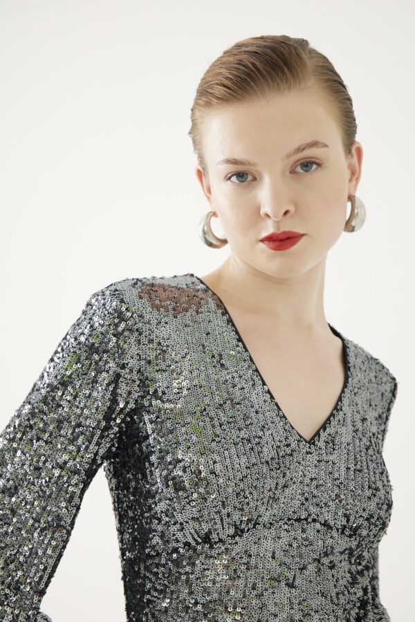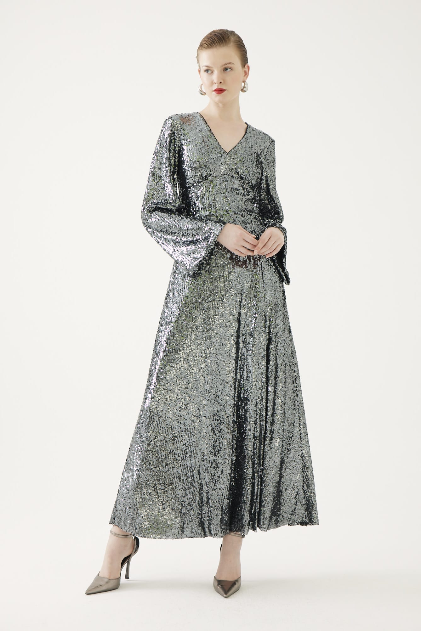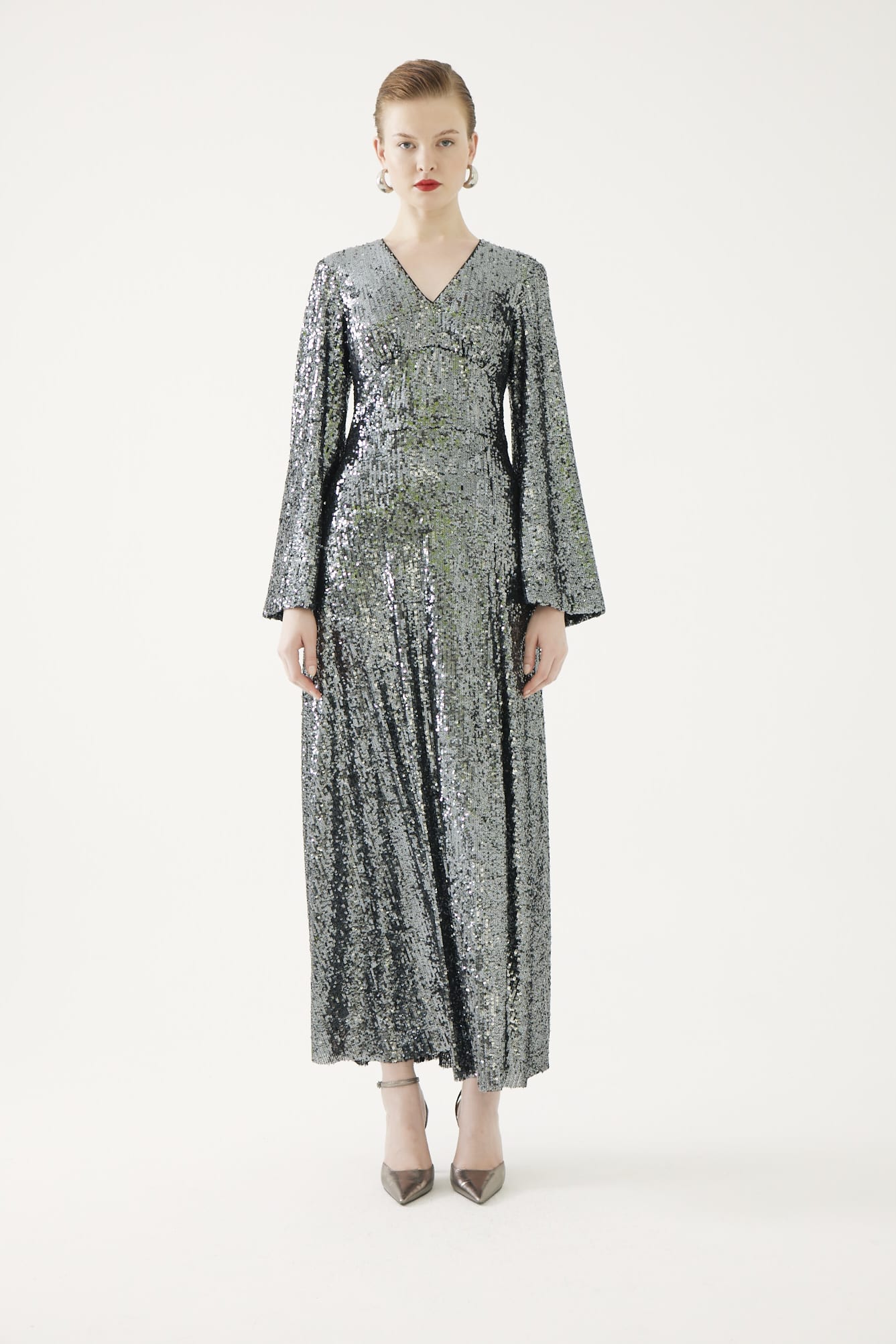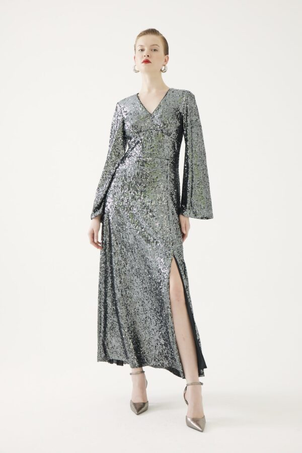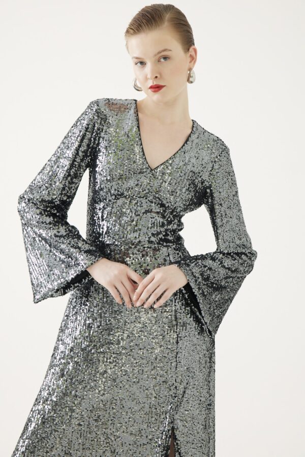 A wow factor piece. A touch of Hollywood glam with this full length sequin maxi with a slit to the front, waist panel to accentuate the waist, a v neckline and full length bell sleeves. Full Lined.