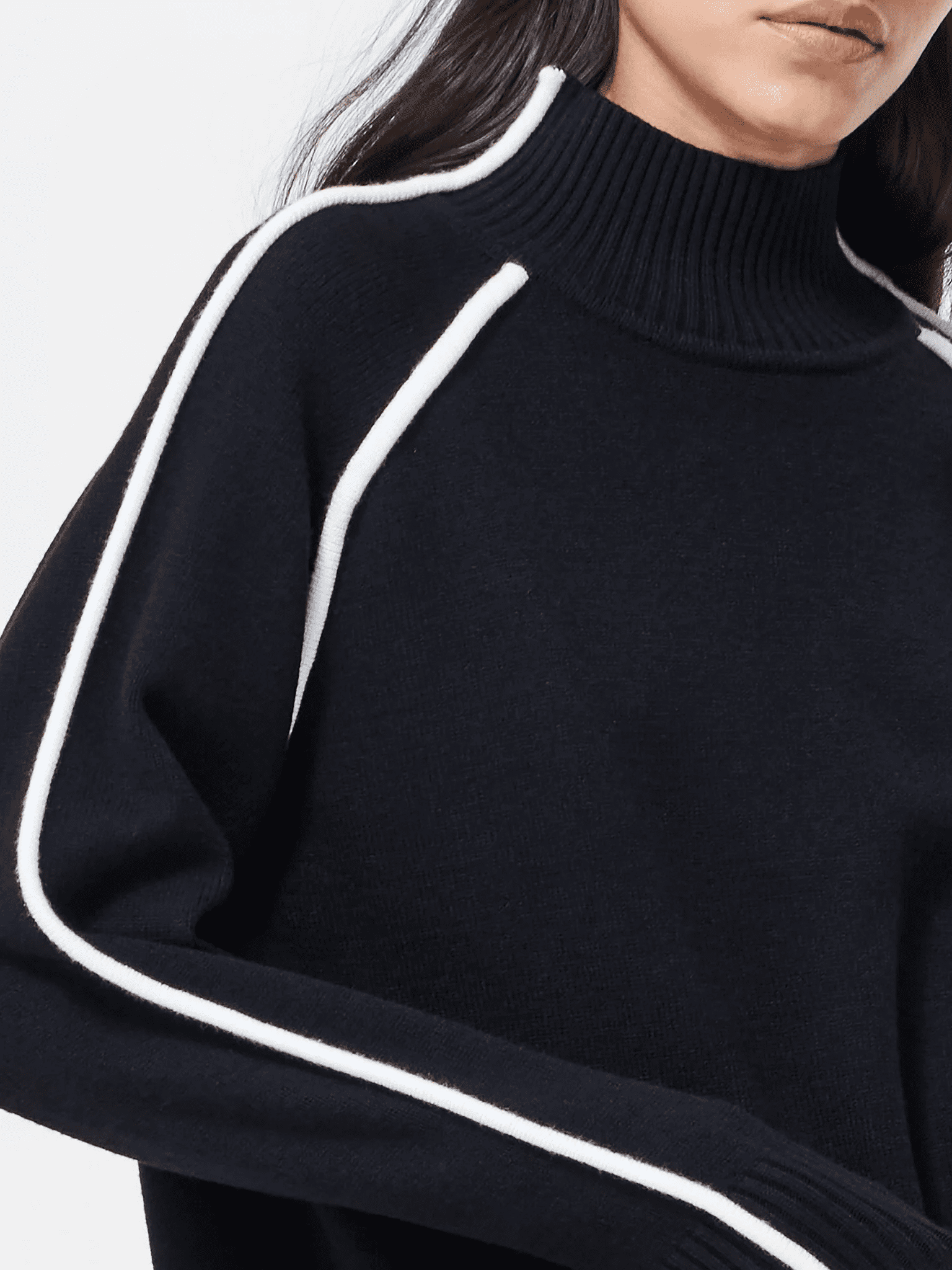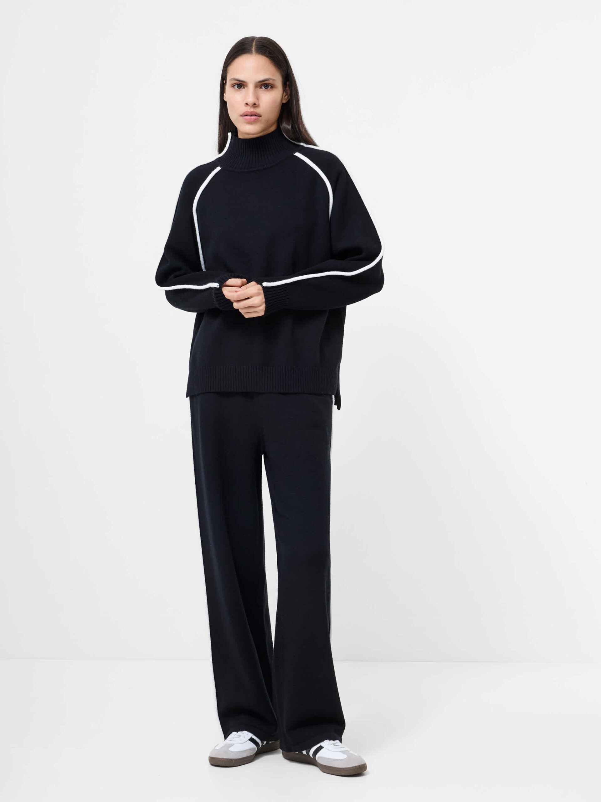 Super cosy black knit high neck jumper, with cable knit hem and cuff and white piping detail. Worn perfectly with the matching Jordan Trouser Black/Porcelain Cream perfect comfort for those chilly days.