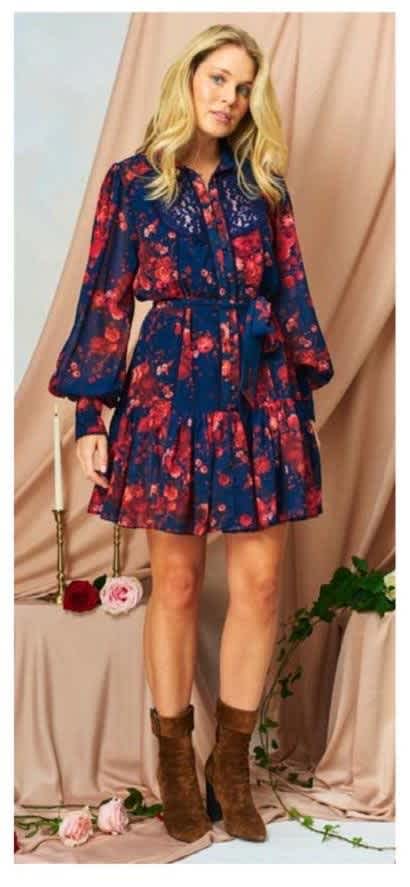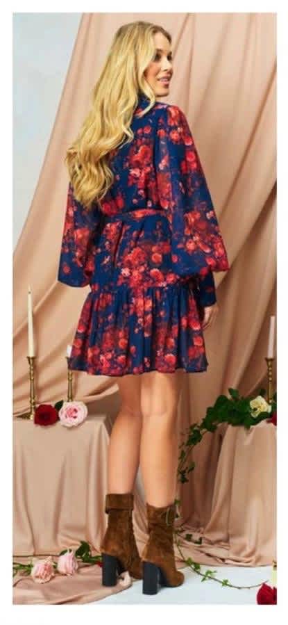 Beautiful navy and deep red floral smock dress with same fabric belt and long sheer sleeves. The dress is fully lined.