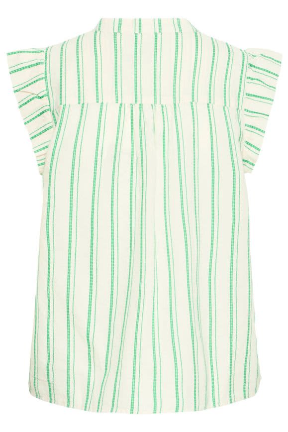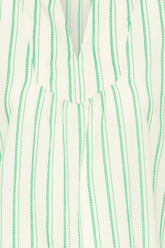 This ivory top features a green stitched stripe throughout. It has a V neckline with a grandad collar and a ruffled cap sleeve. This top is a relaxed fit and would look lovley styled with denim shorts on warmer days or jeans. Worn as a co ordinating outfit with the Jovil Stripe Shorts