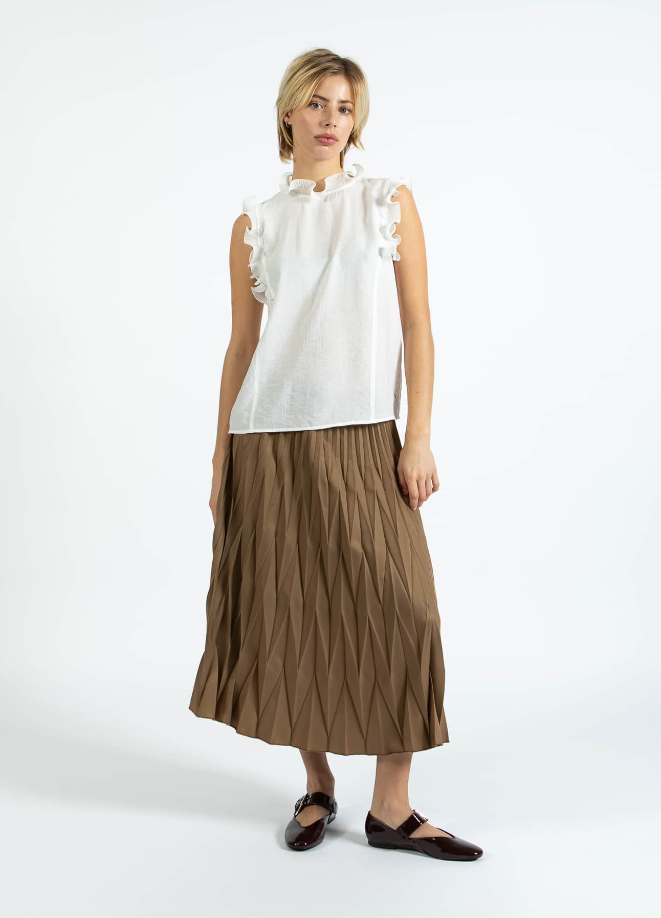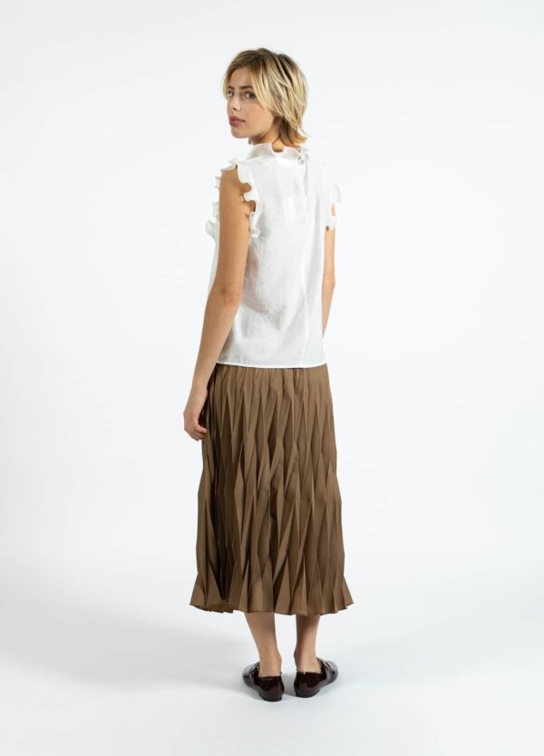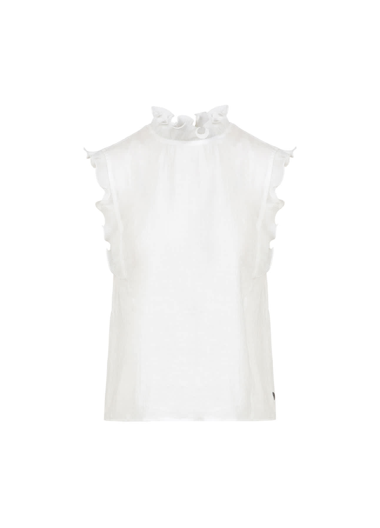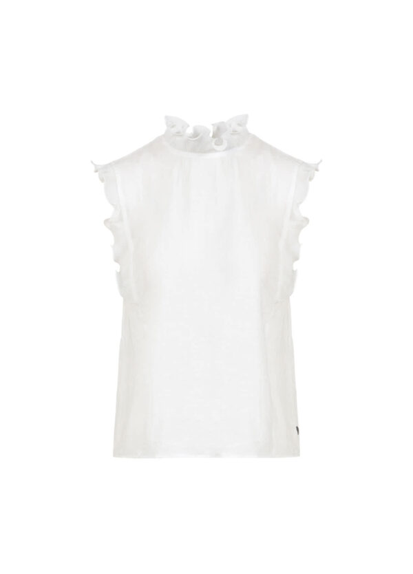 Semi sheer sleeveless top with pretty stand up frill detail around the neck and shoulder.
