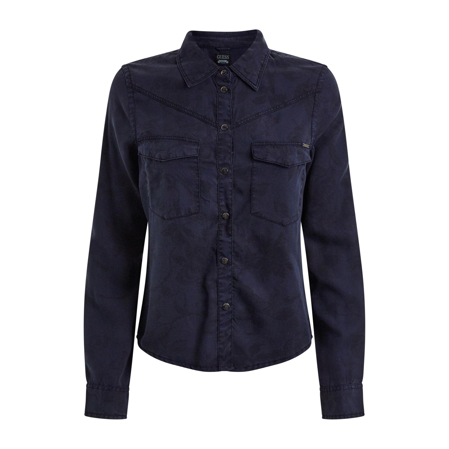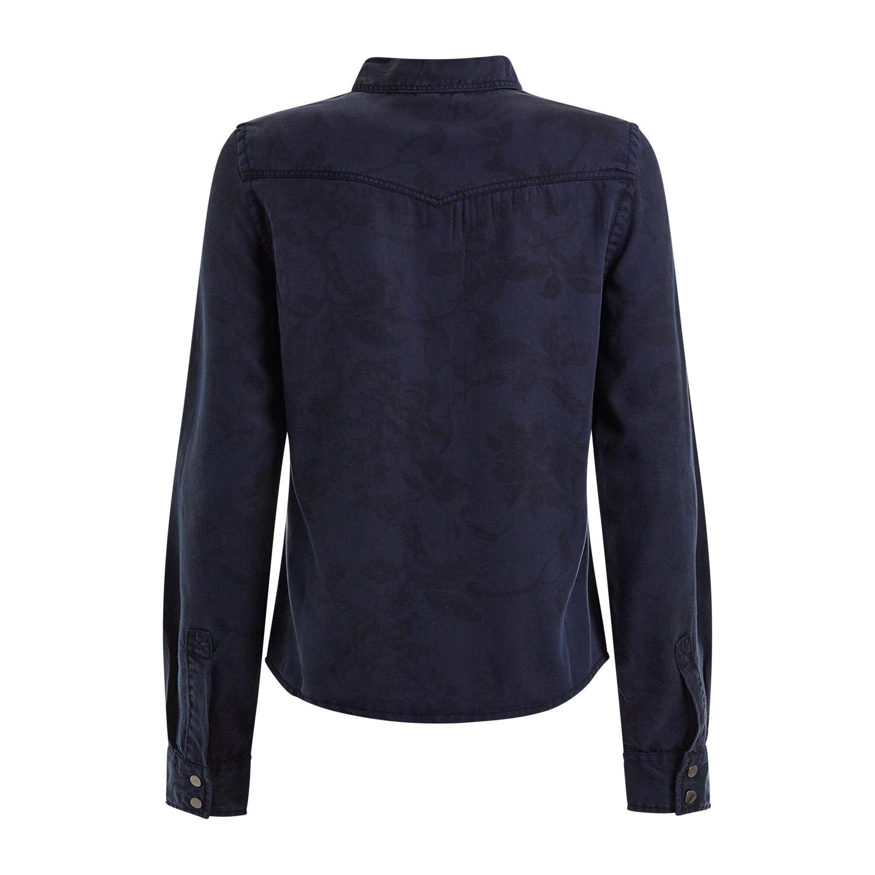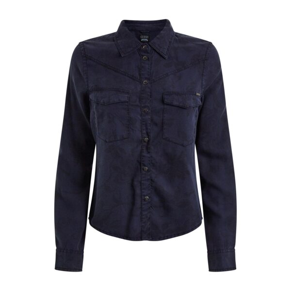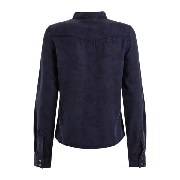 Twilight navy with dark floral silhouettes throughout. Long sleeve. Tailored shape and two front pockets.