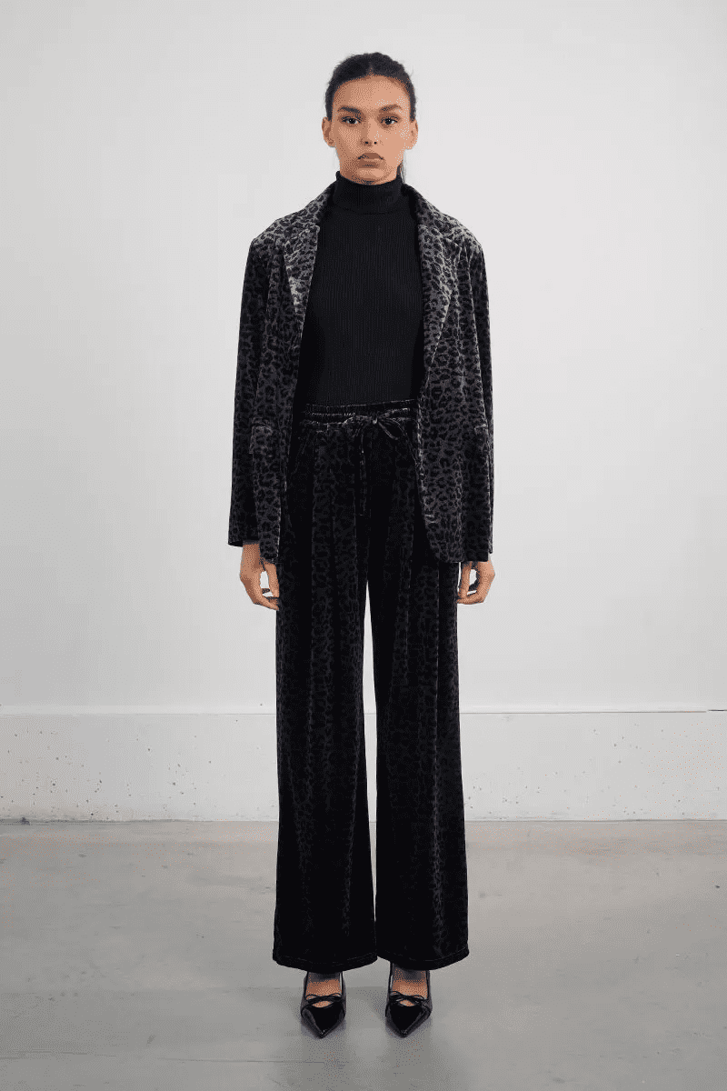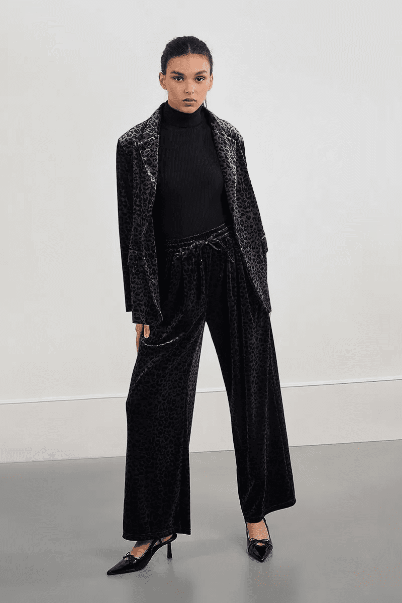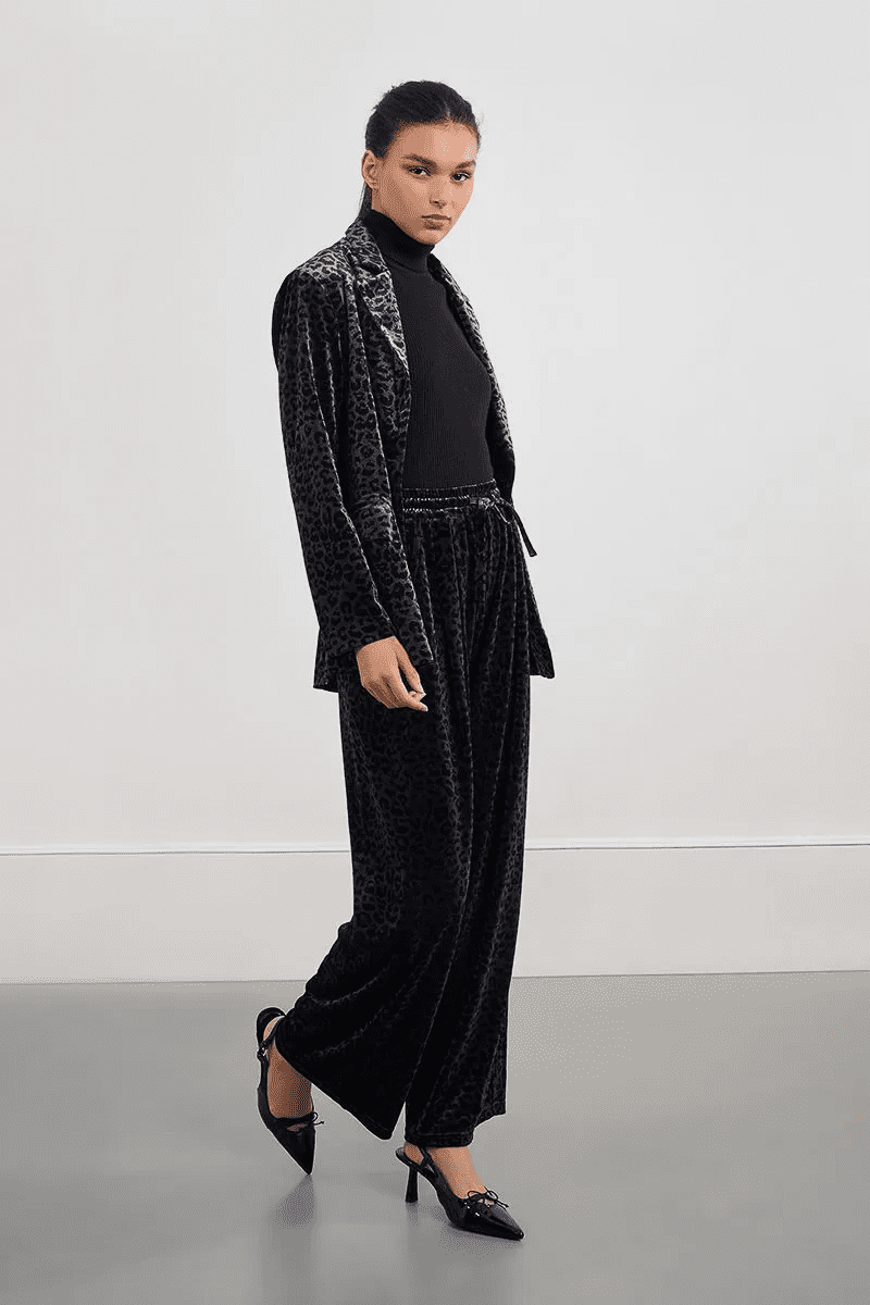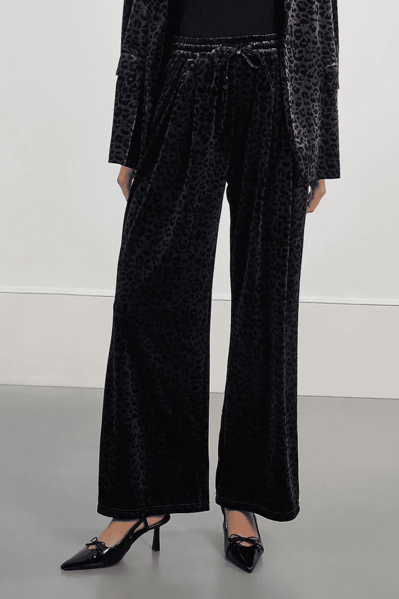 Soft, wide leg dark grey velvet trousers with a black leopard print pattern. The trousers have an elasticated waistband, pleated front and side pockets.