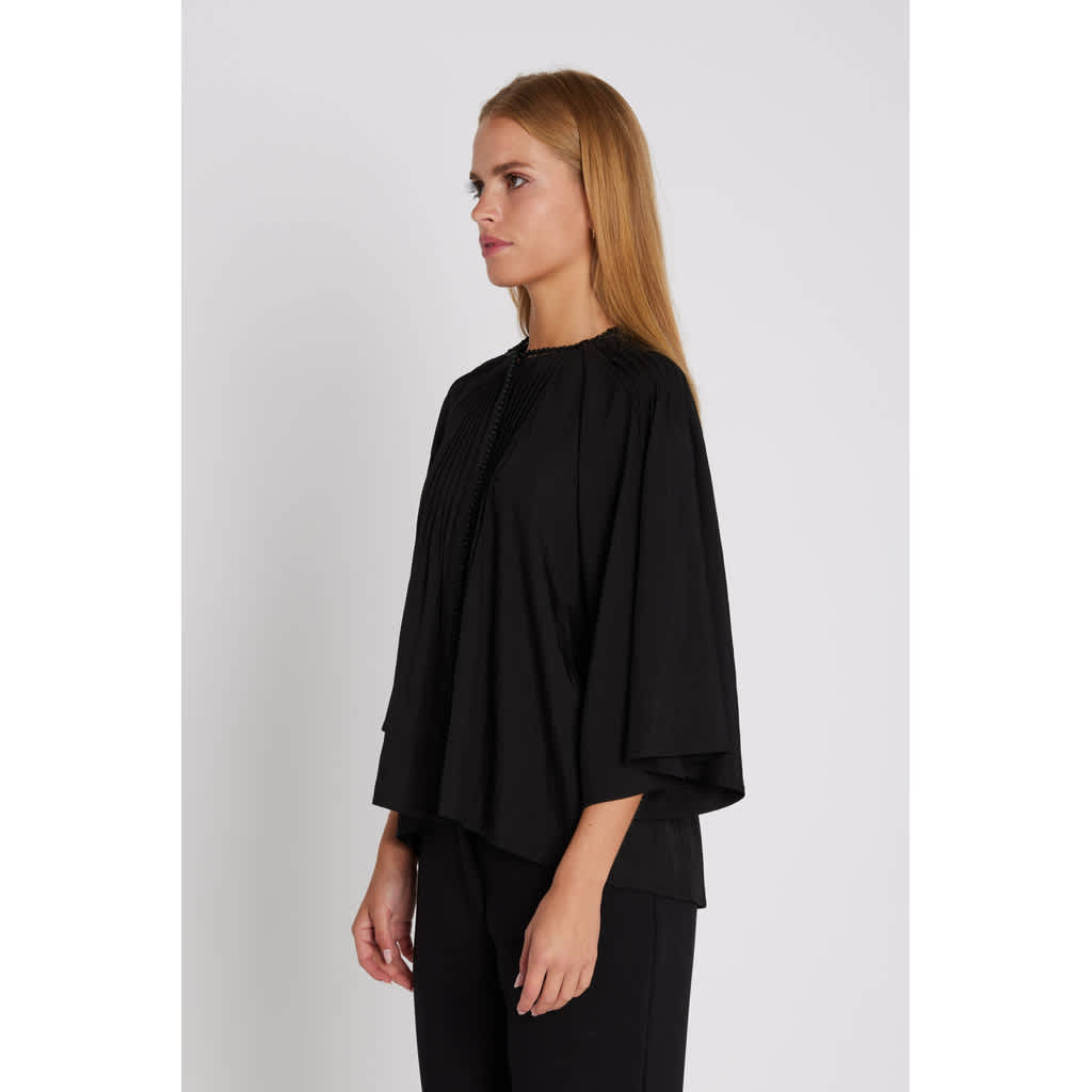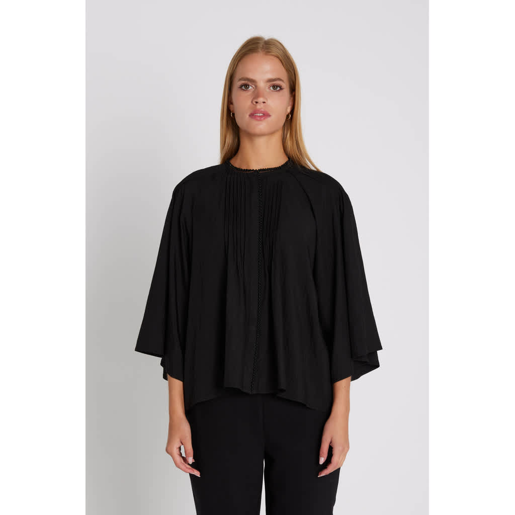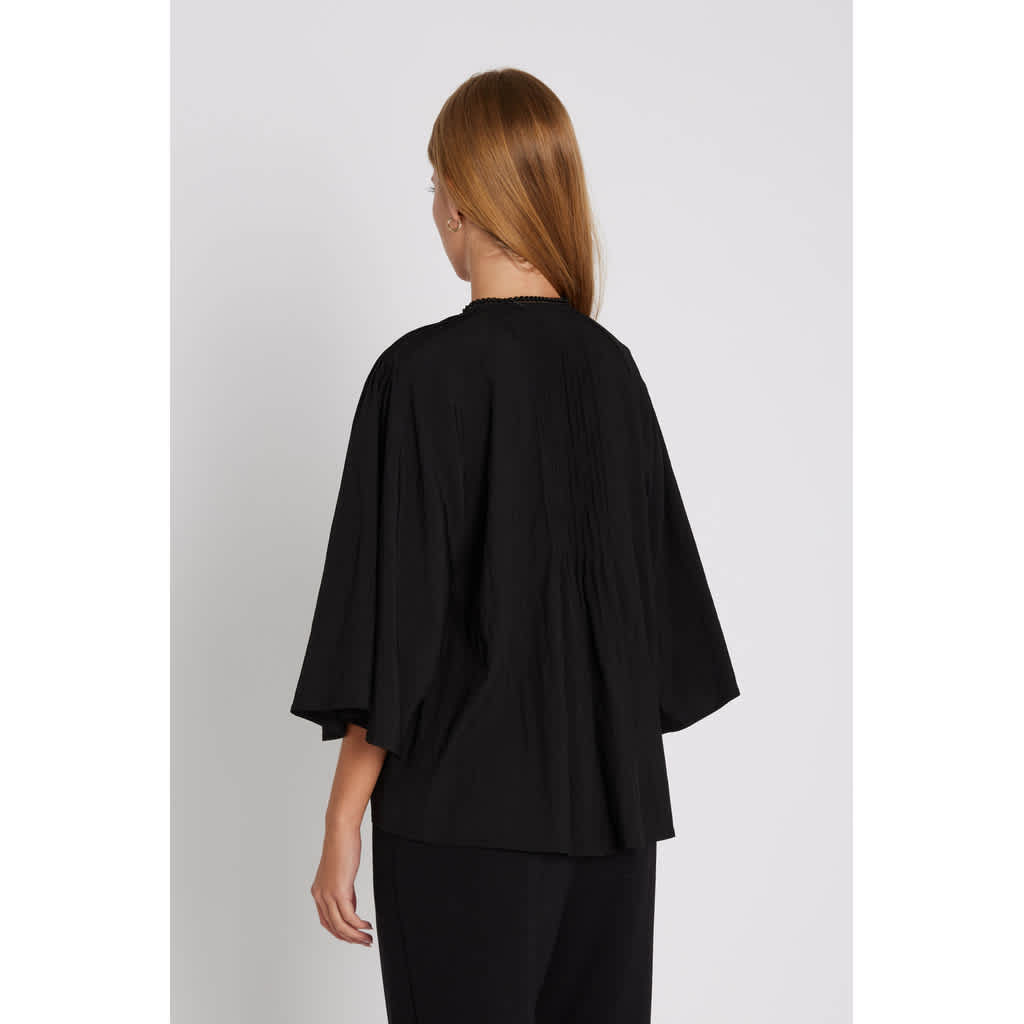 Kassia is a feminine shirt with a loose silhouette, wide three-quarter sleeves, and delicate pleats at the front and back. Style it open over a tank top and jeans for a relaxed look, or closed with pants and boots for everyday wear.