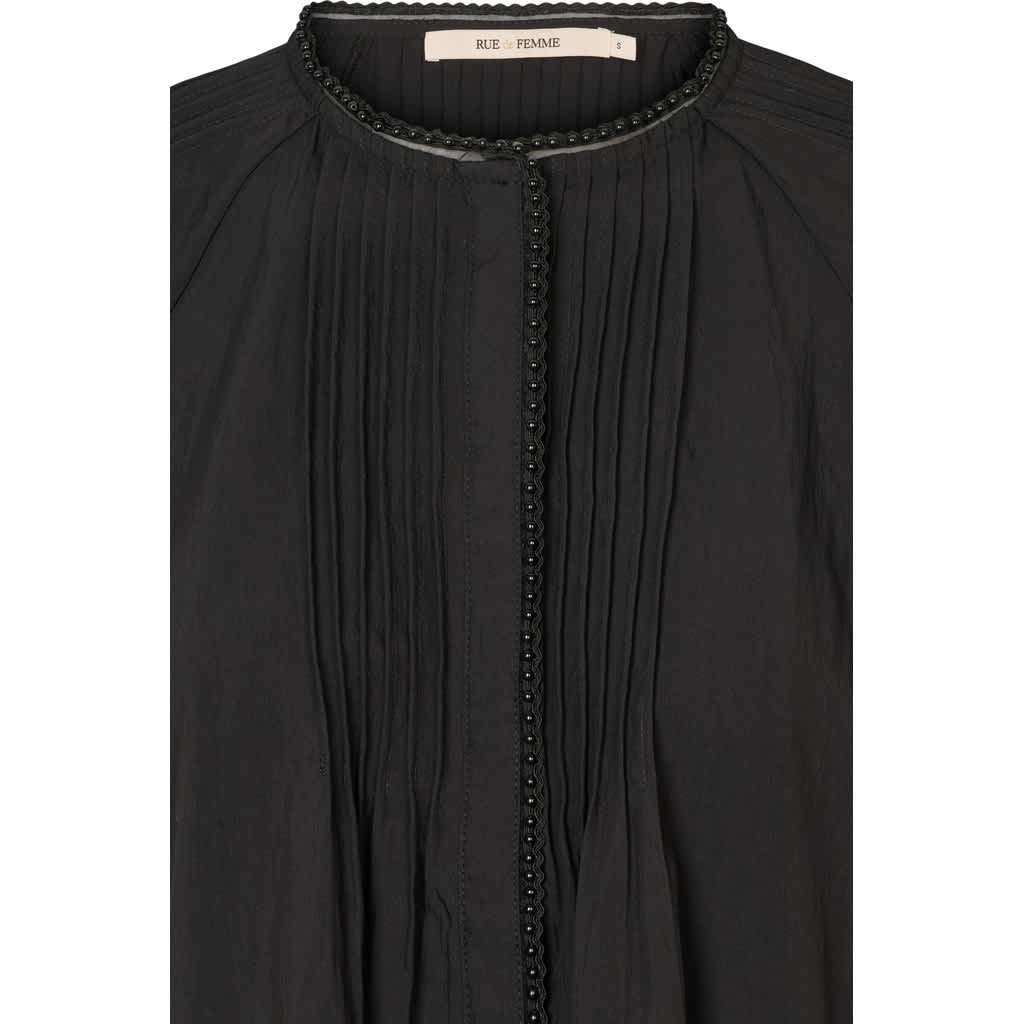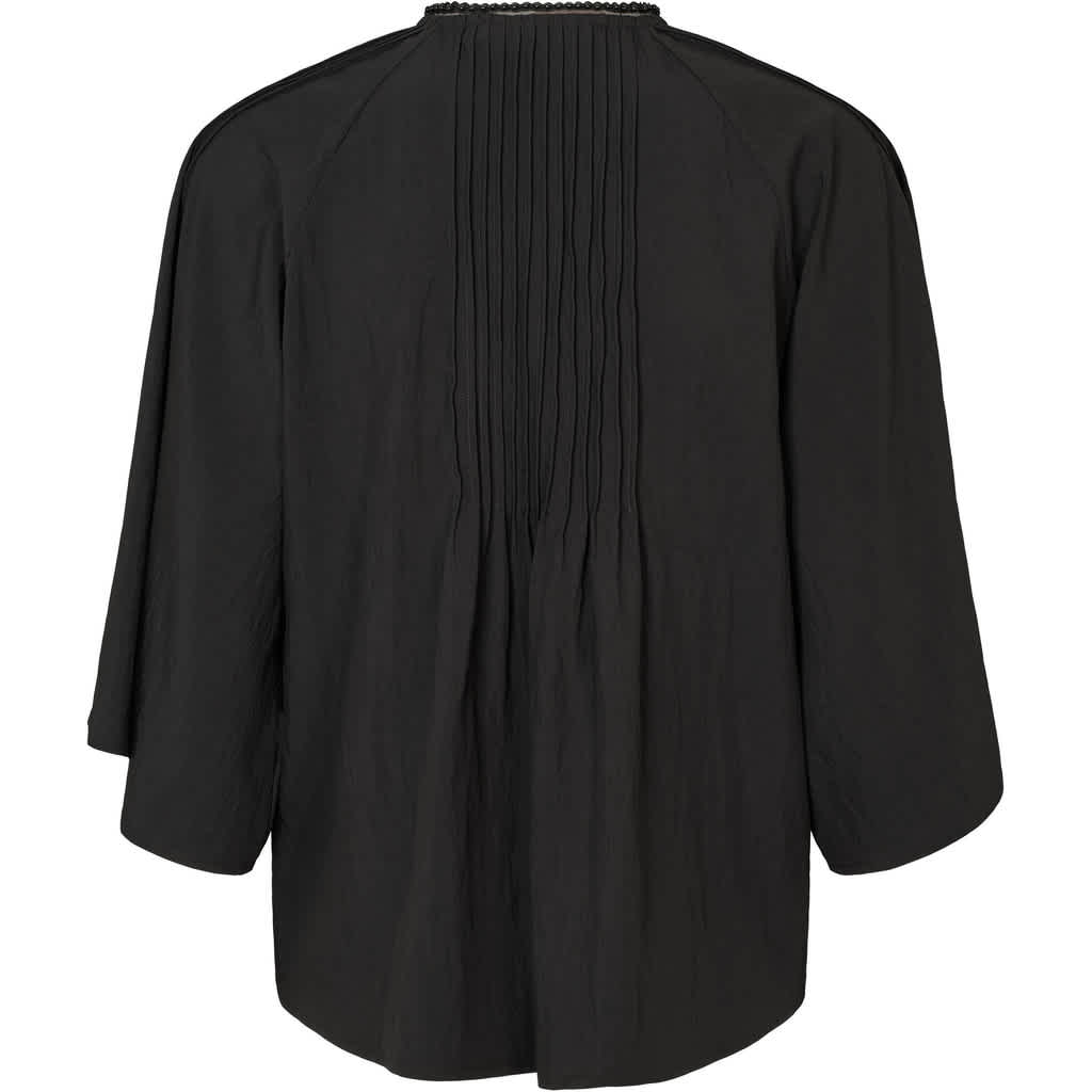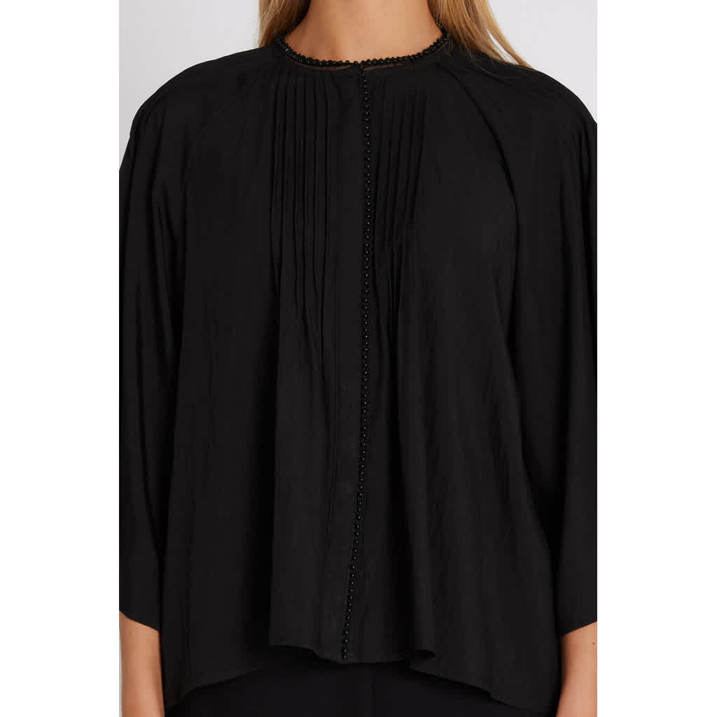 Kassia is a feminine shirt with a loose silhouette, wide three-quarter sleeves, and delicate pleats at the front and back. Style it open over a tank top and jeans for a relaxed look, or closed with pants and boots for everyday wear.