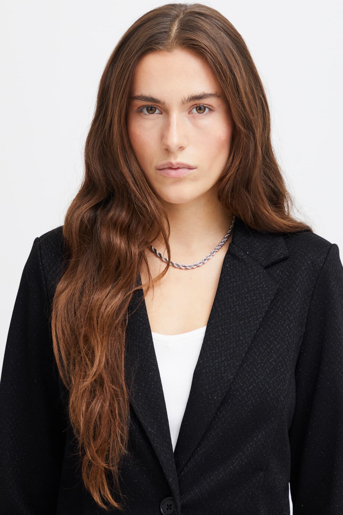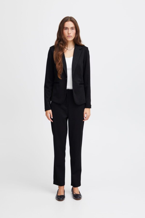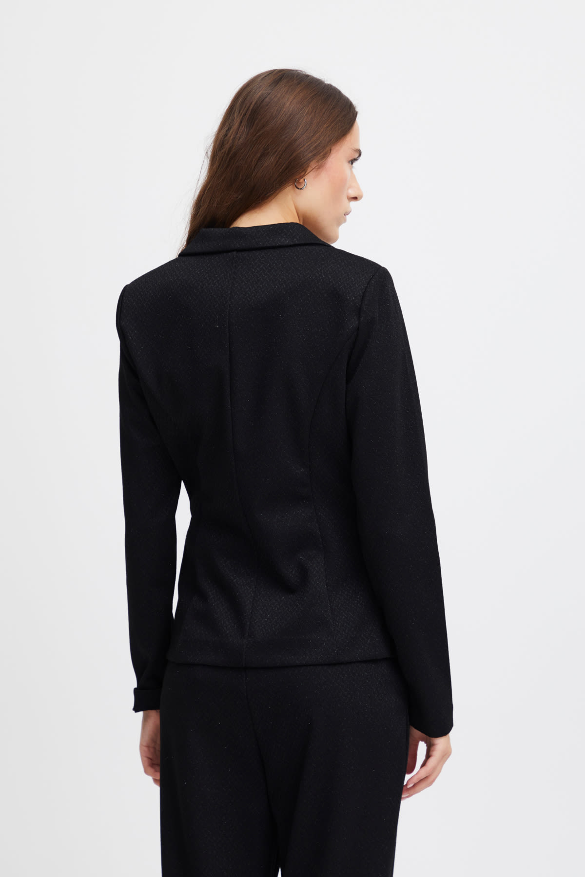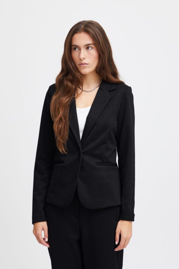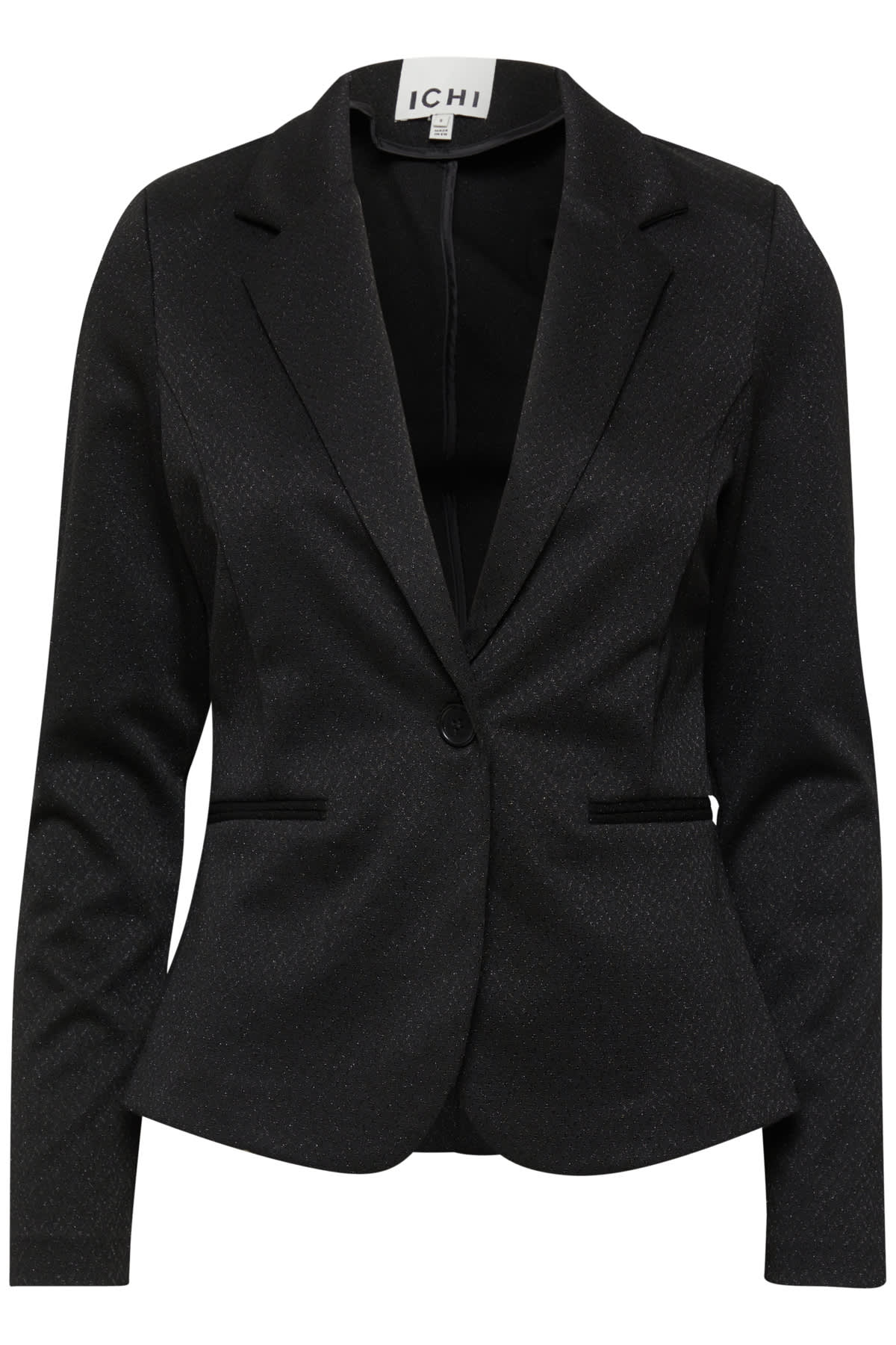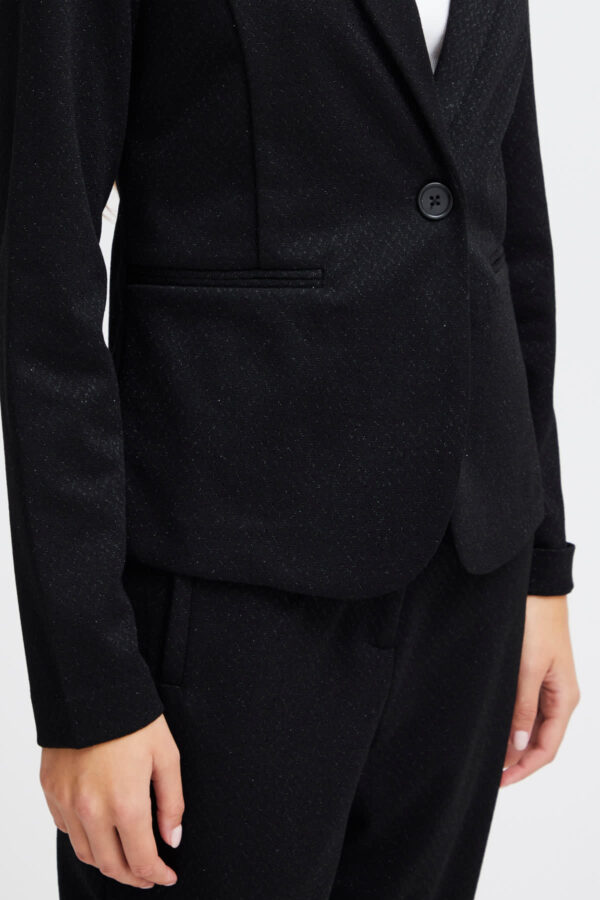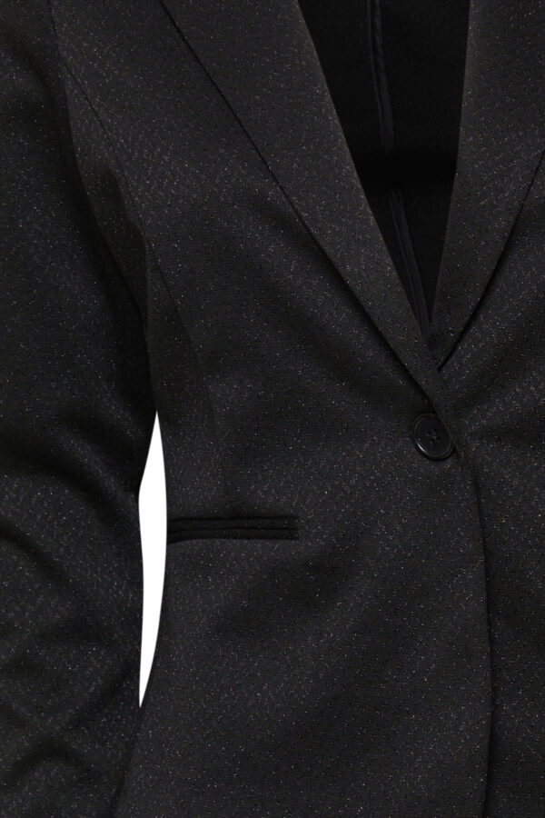 This glamorous has long sleeves and a lapel collar. The blazer closes with a button and has two imitation welt pockets at the front. Pair with the Kate Wide Leg Pants Black Sparkle for a glam head to toe look.