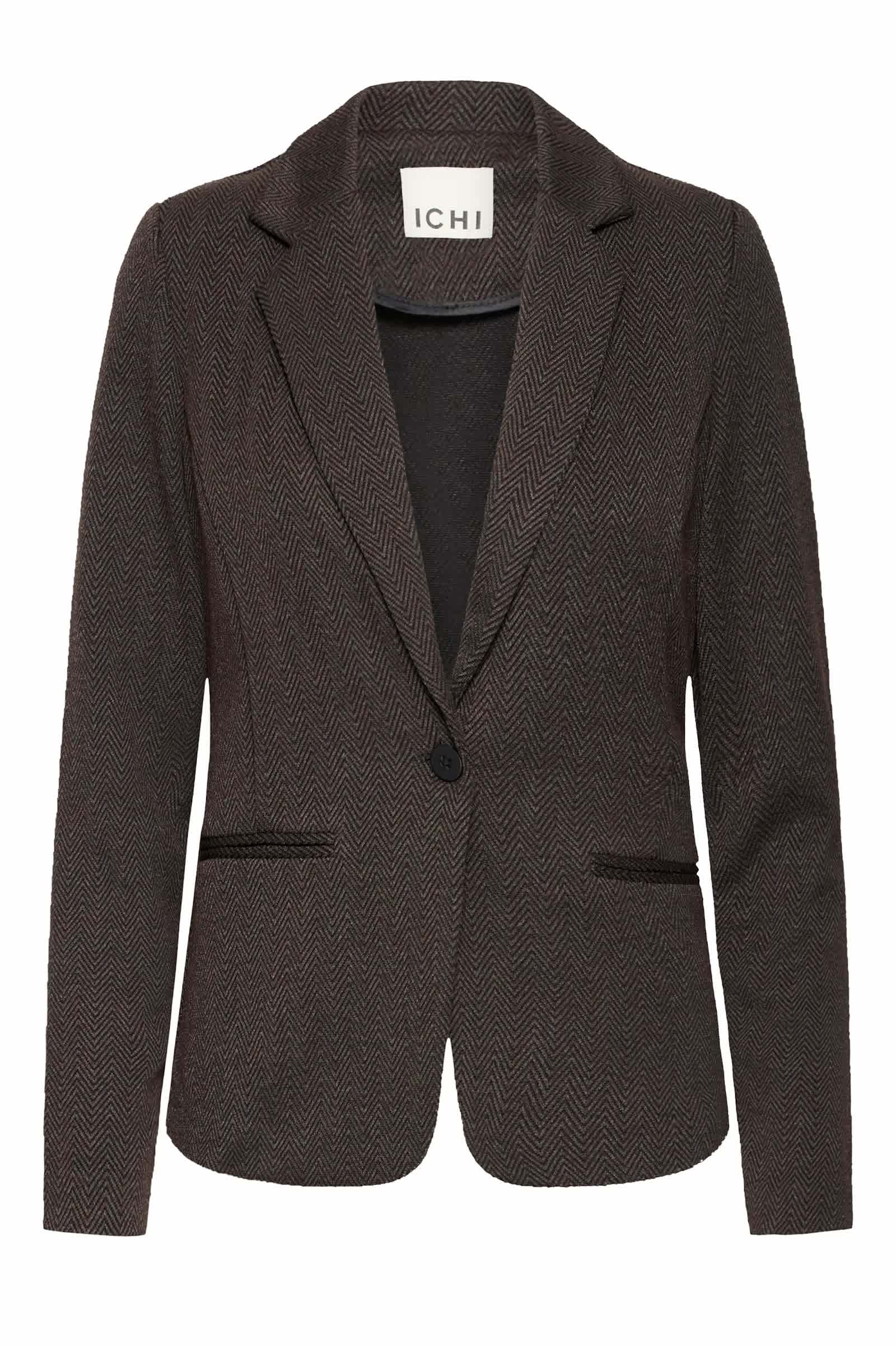 Our classic Kate Blazer in a brown and black herringbone pattern. Worn perfectly with the matching trousers.