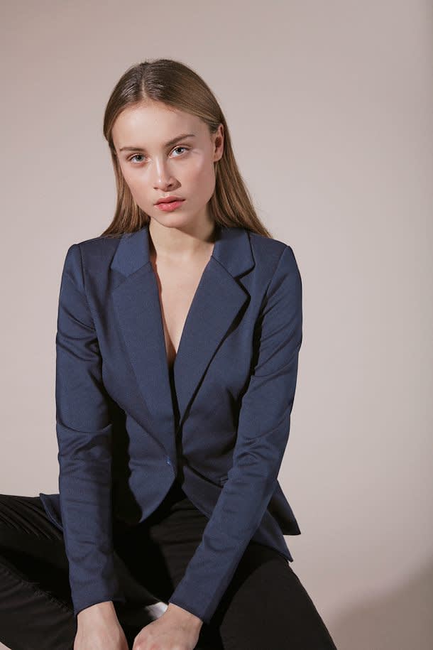 The Kate blazer is a great easy-wearing, classic addition to your year round wardrobe. A simple yet great quality piece that can be teamed with various separates to both dress up or dress down. The fabric has a nice stretch to it, long sleeved, button up with pocket detail. To complete the full suit look pair with the Kate Wide Leg Trouser Navy.