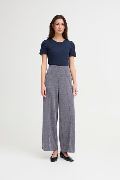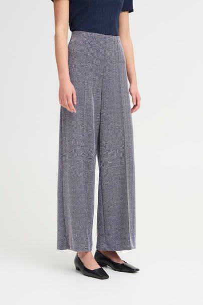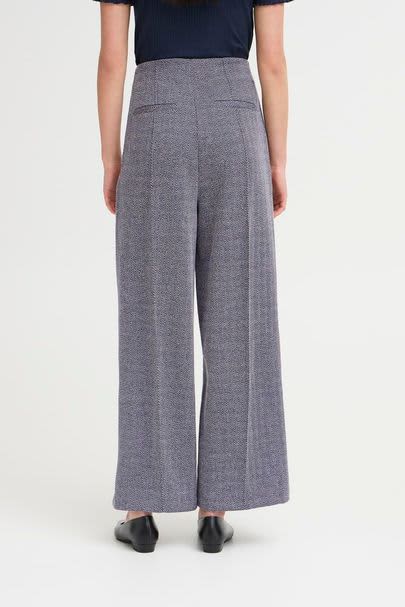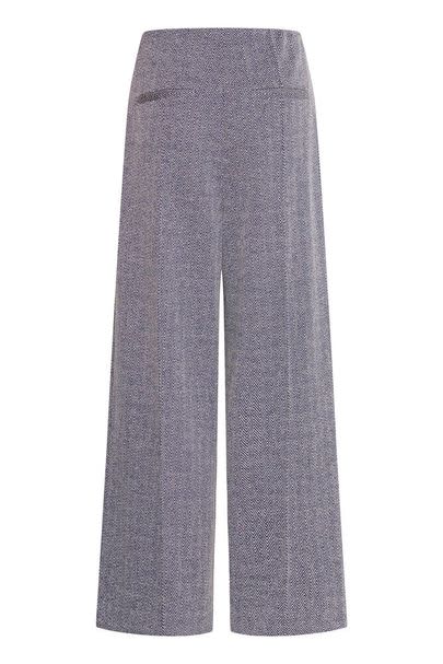 These blue herringbone pants feature an elasticated waist and a wide leg. They also display piping down the front and back of the leg and faux pockets on the backside for a nice professional finish. There is also a hidden zip on the side of these pants with a hidden button to close. The fabric is very soft and has a lovely stretch to the material making these both stylish and comfortable. Wear with matching Kate Oversized Blazer Blue Herringbone.