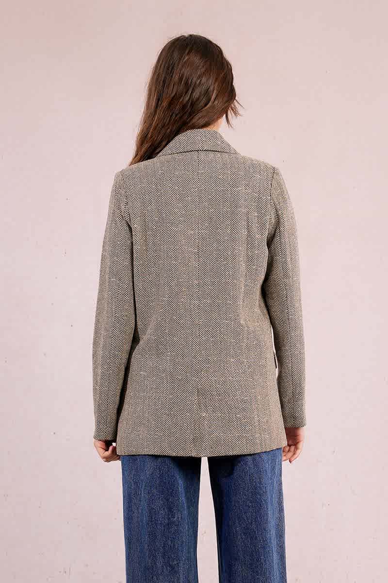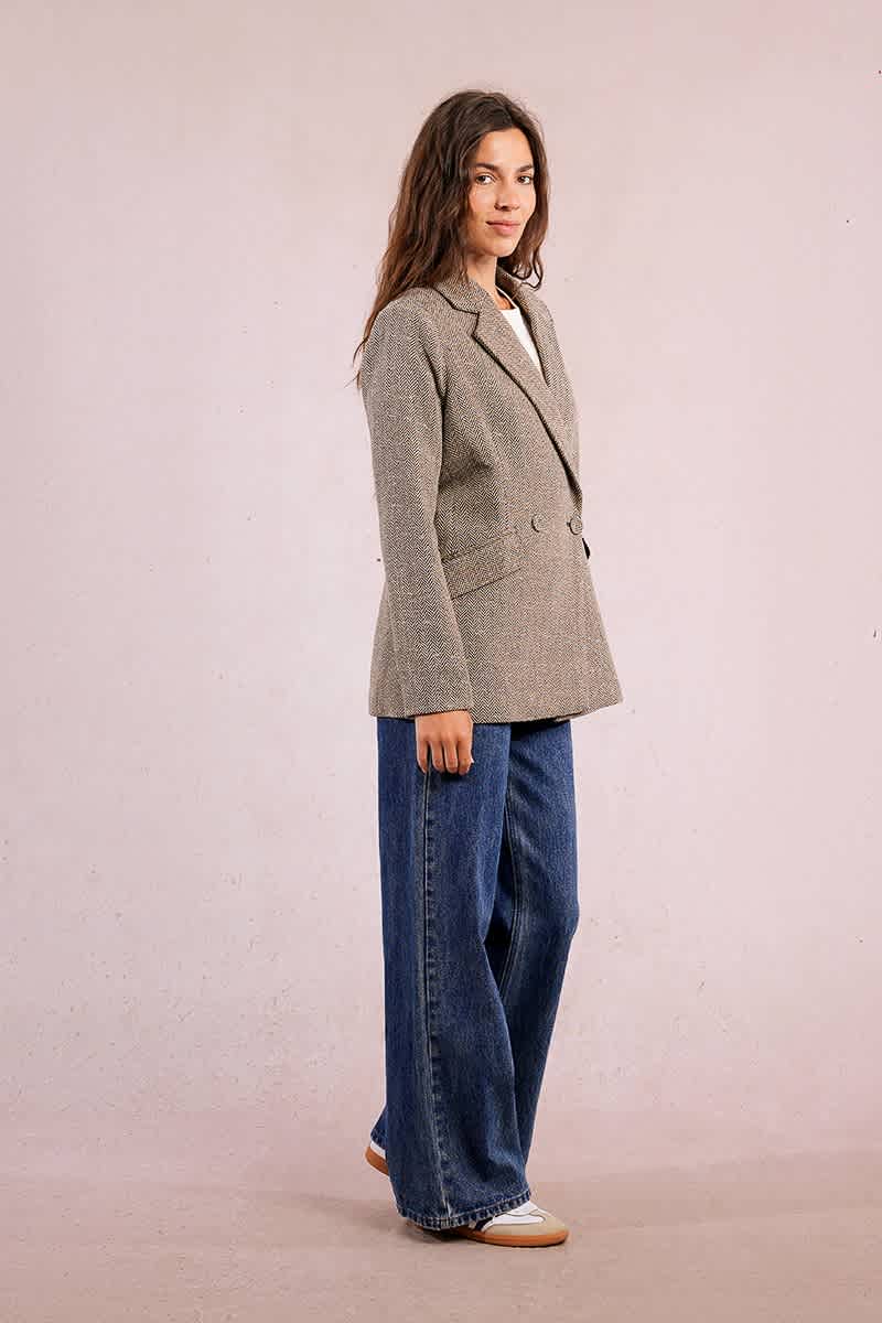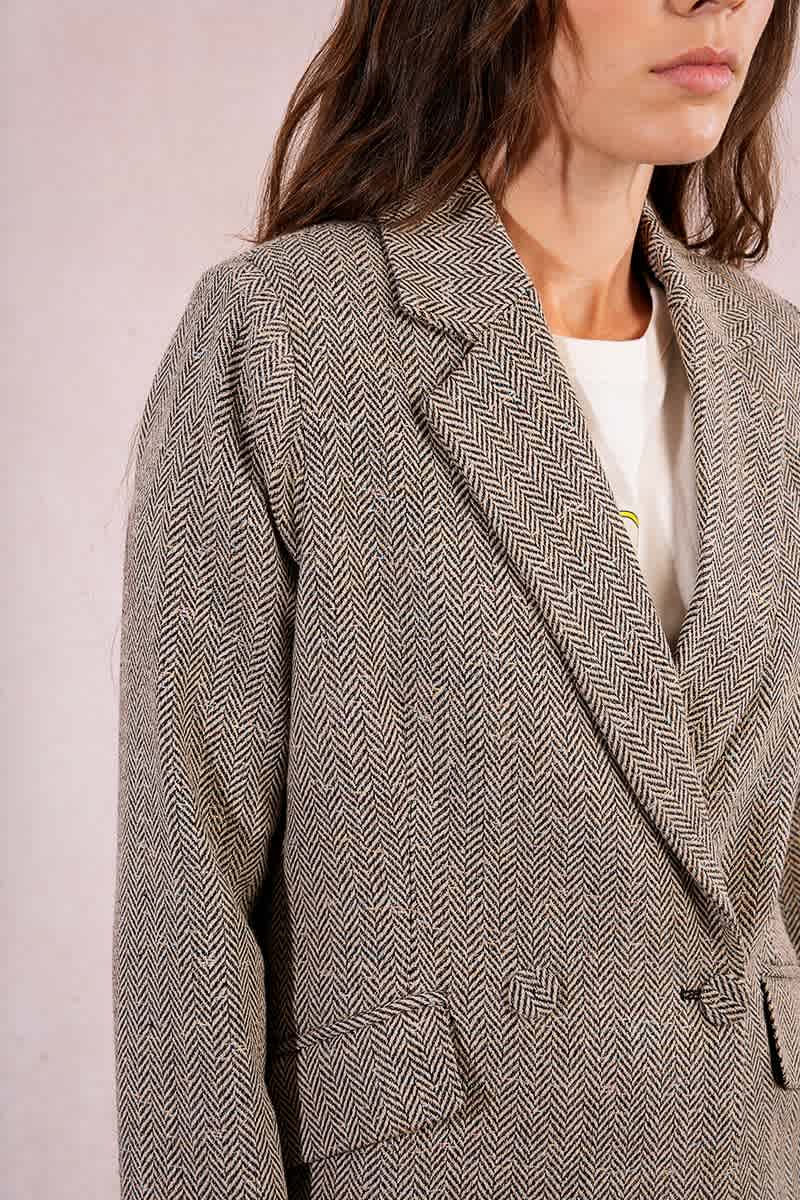 Beige oversized blazer with black herringbone pattern and multi coloured metallic thread. The blazer is double breasted button close and has 2 front pockets. Worn perfectly with the matching Kehlani Herringbone Pants Black/Beige