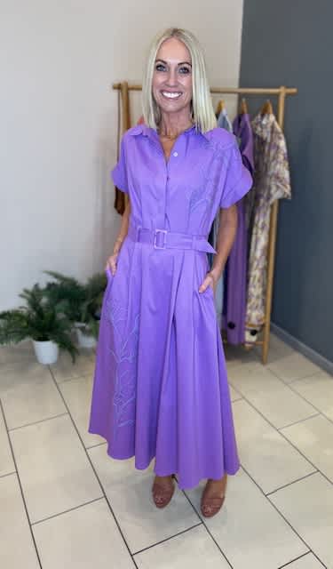 This short sleeve midi dress in Lilac features a hidden button down front to the waist and a collar. It is belted and displays a floral embroidered detail on the upper left and lower right front side of the dress. There is a zip detail on the left hand side of the dress under the arm. This dress has pockets and a beautiful A-line shape giving an elegant silhouette.