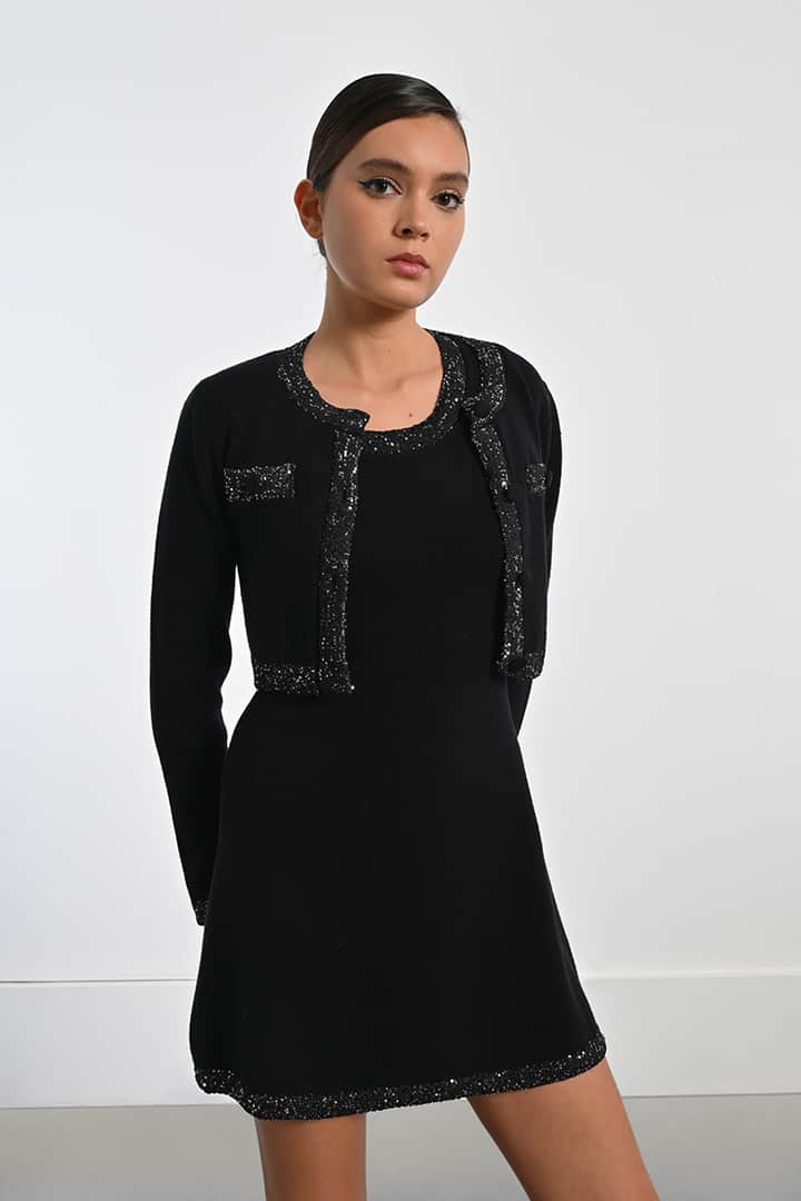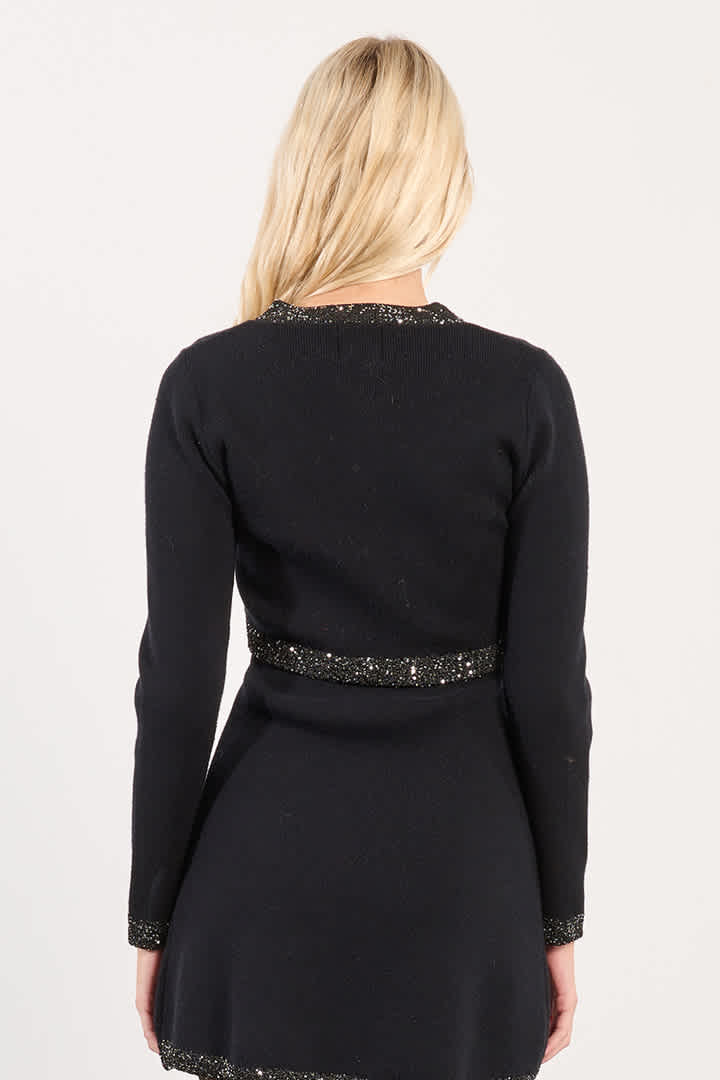 Cropped black knit cardigan with silver sequin detail on the neckline, hems and cuffs. The cardigan has a button close and has 2 faux pockets on the front. Worn perfectly with the Kiara Knitted Dress Black