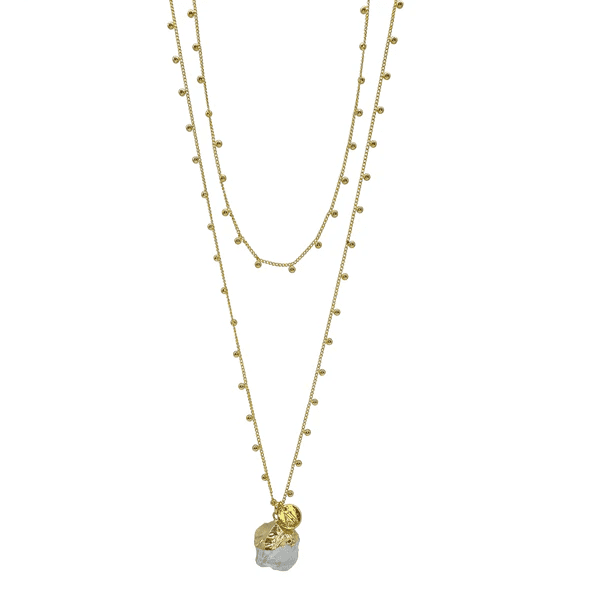 Khione necklace features untreated clear quartz pendant electroplated in 16k gold and set on 16k gold plated decorative ball chain.