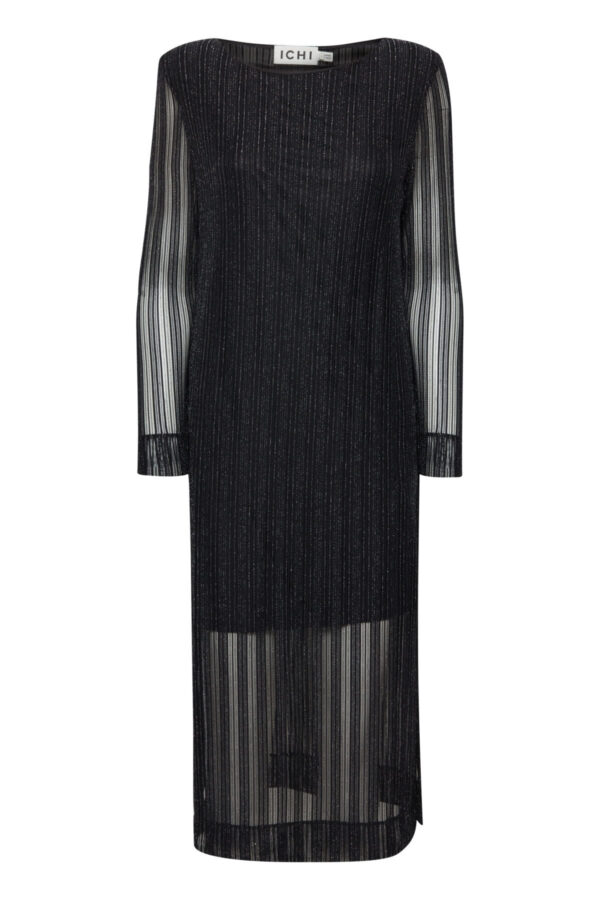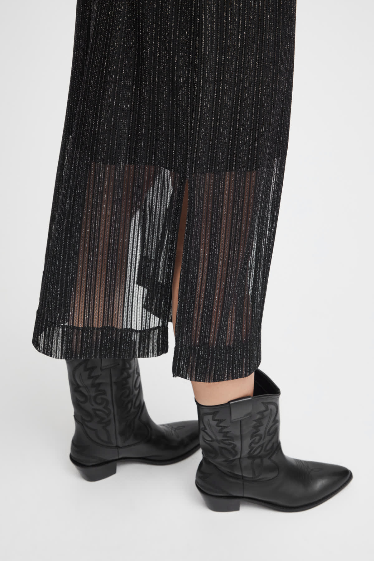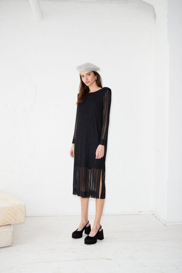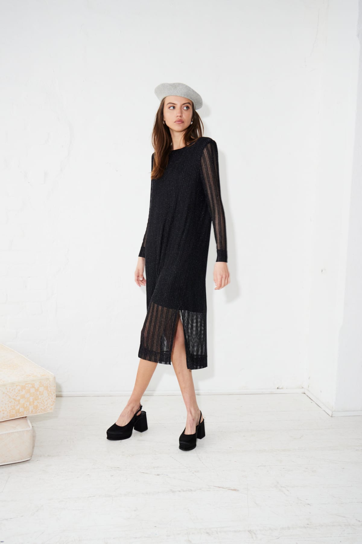 The perfect black dress for a party. This dress features long sheer sleeves and a round neck. It is a midi length dress with a slight stretch in the fabric and a metallic stripe throughout to add a touch of sparkle. This dress is fully lined to the knee. From the knee down this dress is sheer with slits either side of the skirt. A must have for the party season ahead.