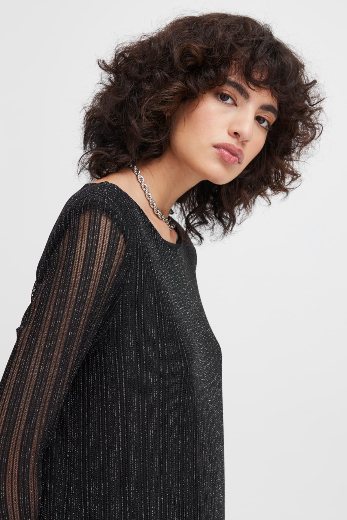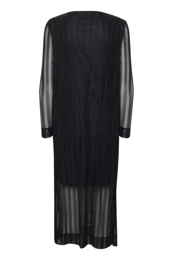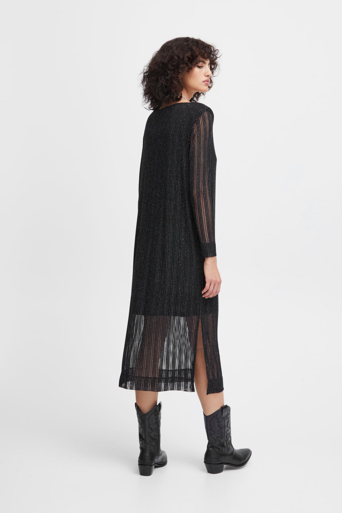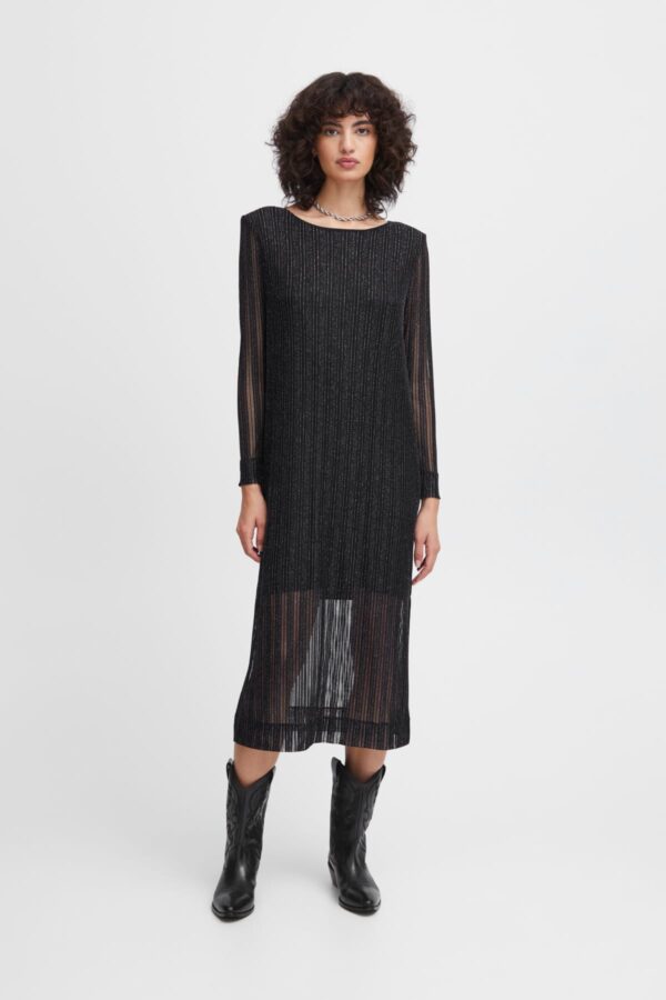 The perfect black dress for a party. This dress features long sheer sleeves and a round neck. It is a midi length dress with a slight stretch in the fabric and a metallic stripe throughout to add a touch of sparkle. This dress is fully lined to the knee. From the knee down this dress is sheer with slits either side of the skirt. A must have for the party season ahead.