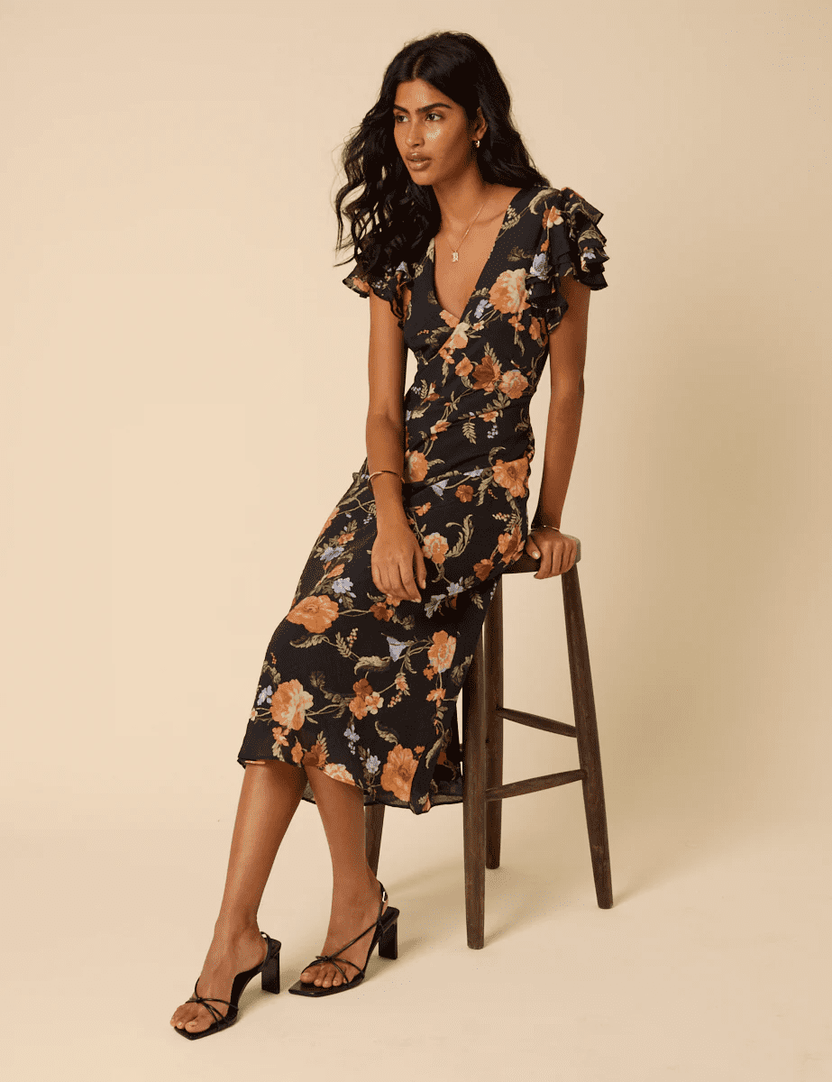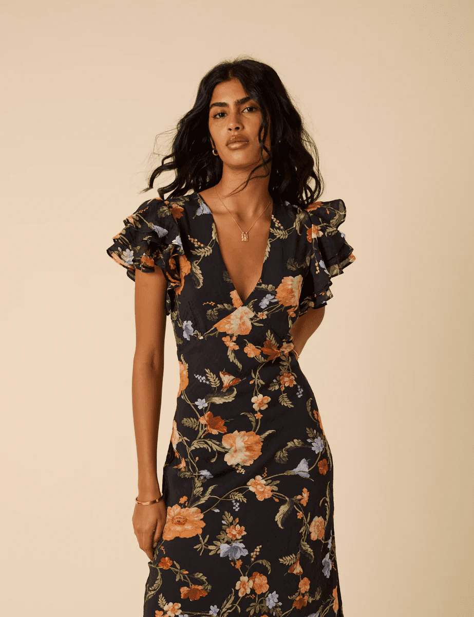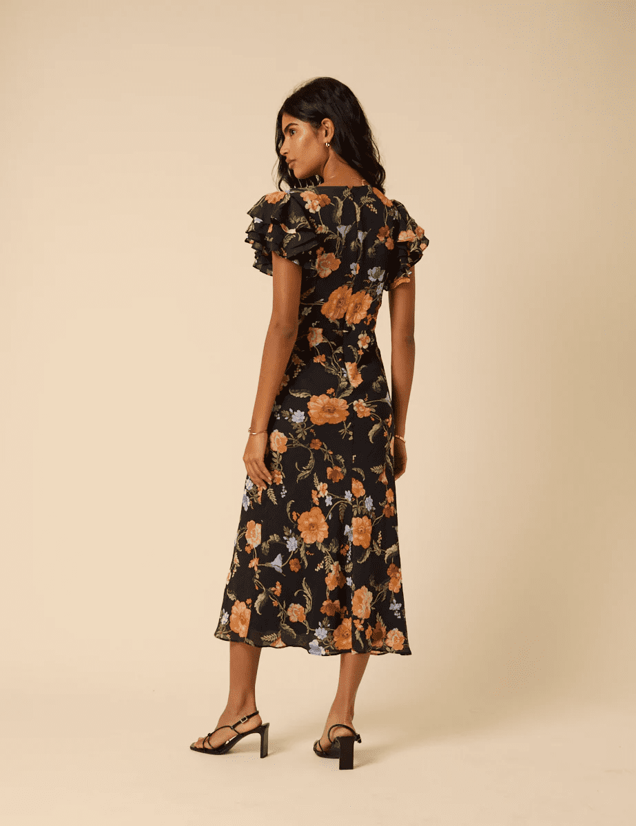 Gorgeous autumnal print dress for day to night. Add a sandal and an earring for special occasion or layer your knitwear on top & bring out the rich tones of the print for a cosy look.