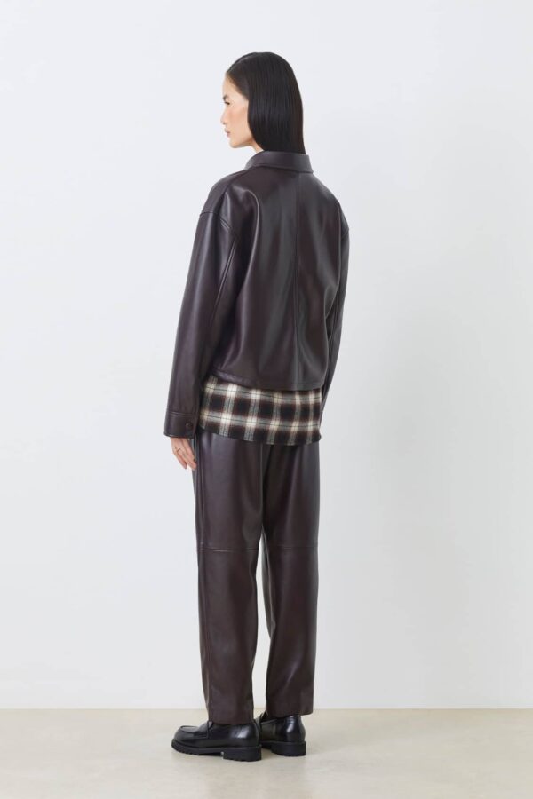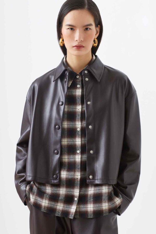 This prune leatherette shacket features a collar with popper buttons down the front to close. There is a popper button on each cuff also. It also fetaures a drawstring either side of the waist to wear either loose or cinched in at the waist. The material is beautiful and soft. Wear as a shirt or a jacket and style with matching Joe Leatherette Pants Prune.
