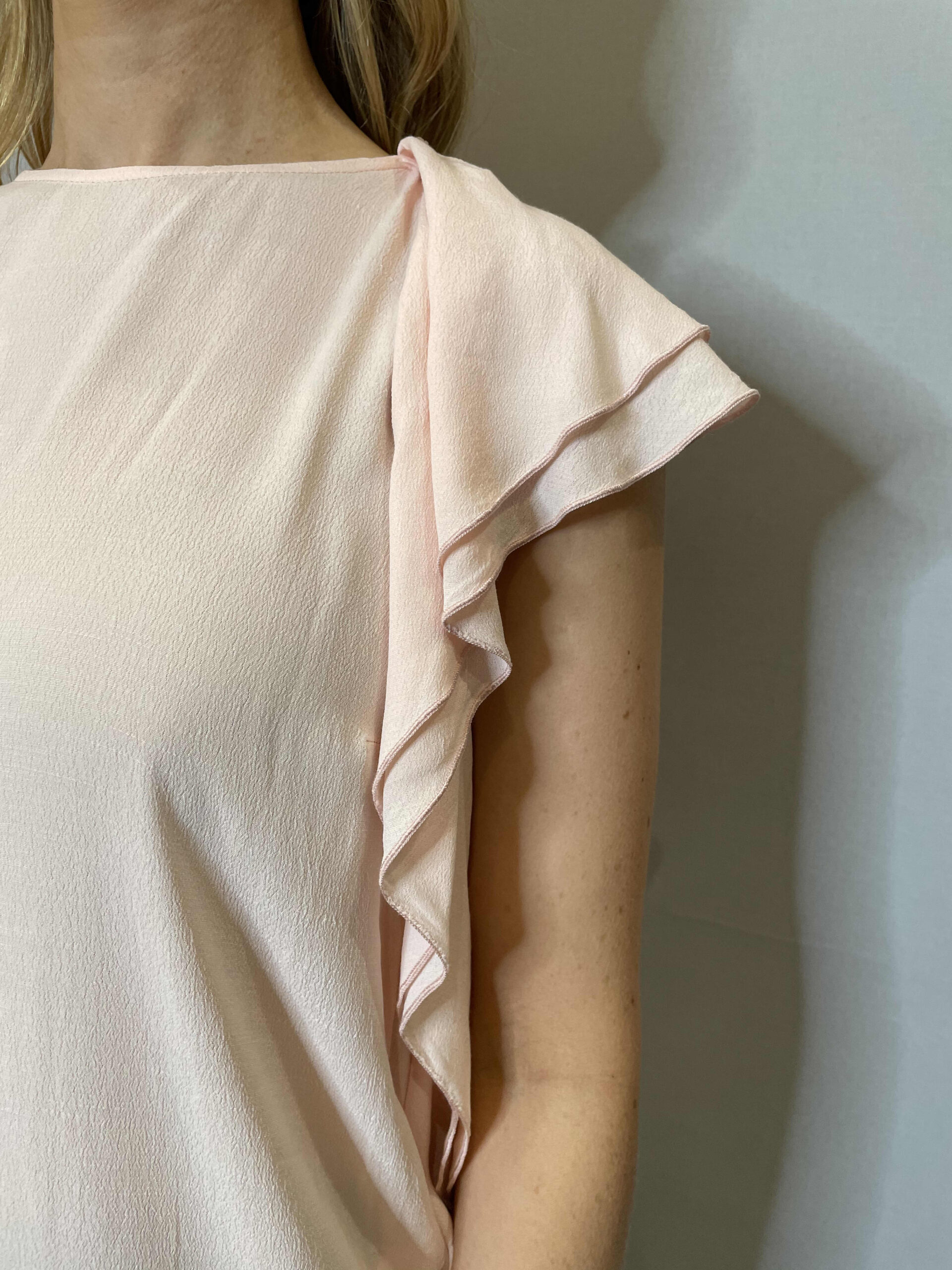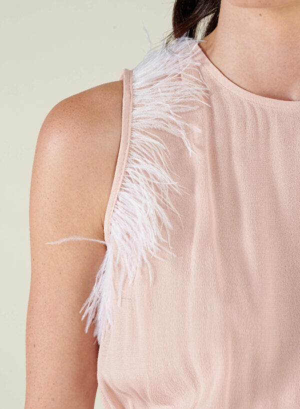 Light and floaty soft pink relaxed fit top. With frill on one shoulder and feather detail on the other.