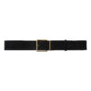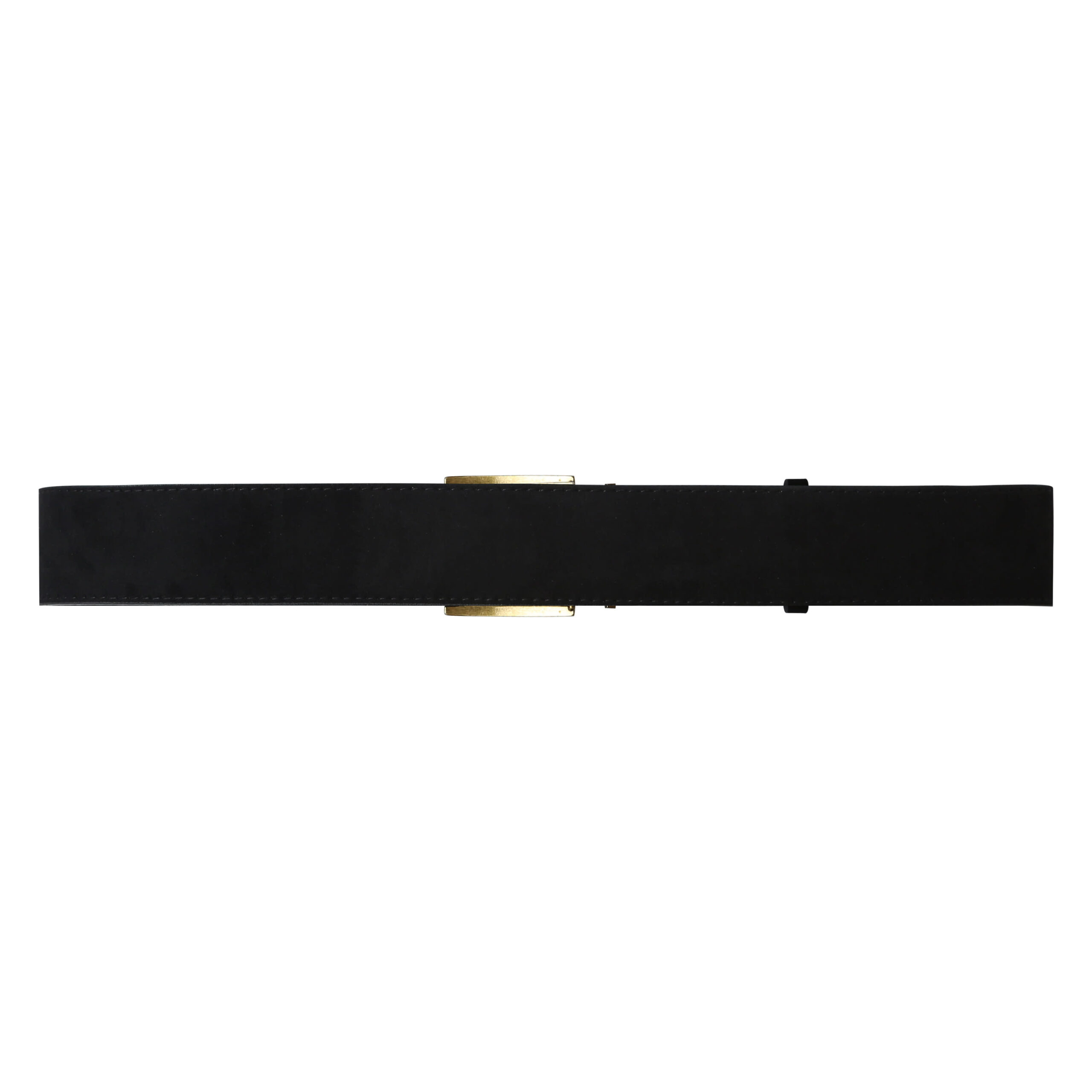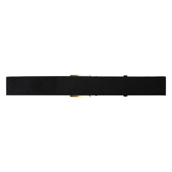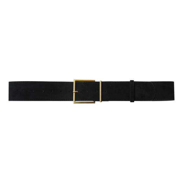 LePrince is a synthetic suede belt with a square gold metal buckle. It is 104 cm long and 5 cm wide.