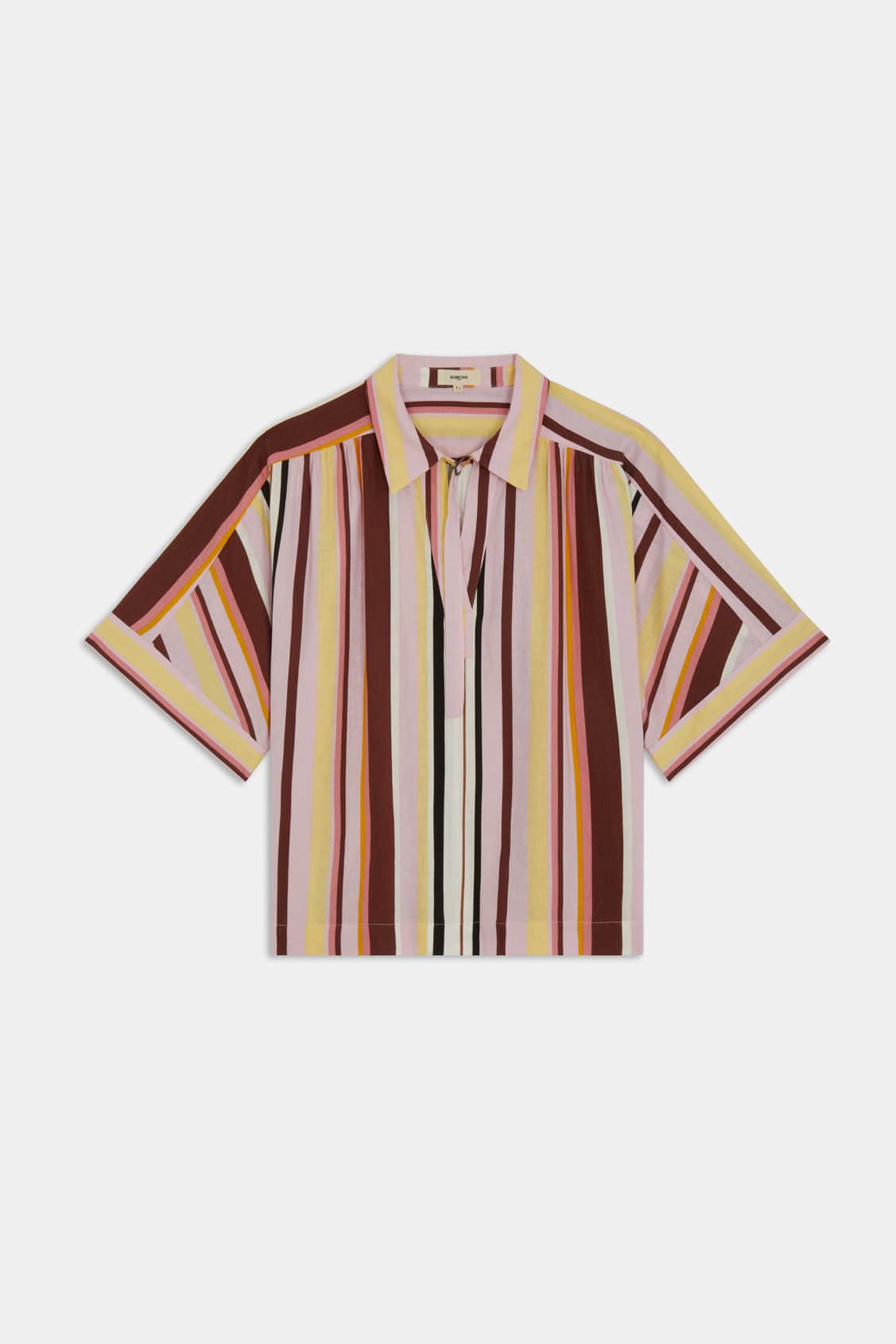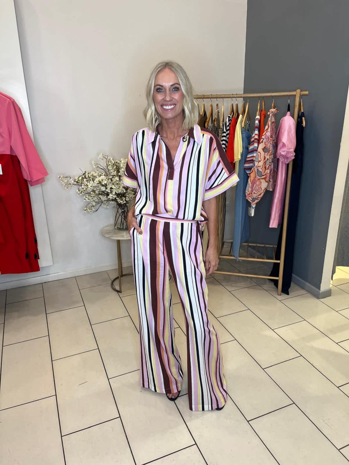 This bright a colourful stripe linen mix top has short sleeves and an open collared v-neckline with tie. Worn perfectly as a co-ordinating outifit with the Jay Multi Trousers